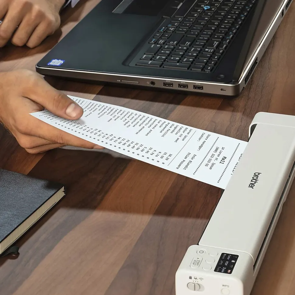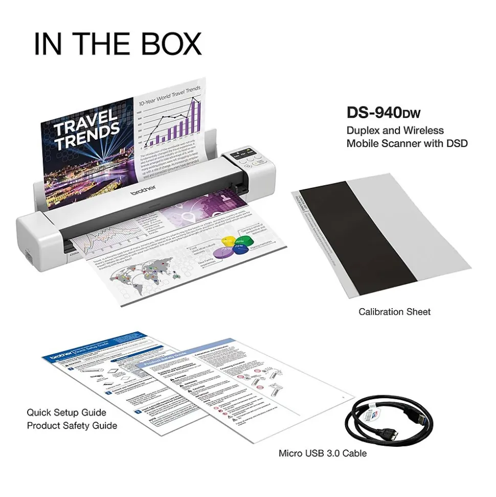 The Brother DS-940DW duplex and wireless compact mobile document scanner is ideally suited for on-the-go, small office/home office professionals featuring its compact, mobile design and simple workflow applications. The DS-940DW features single-pass duplex scanning and a color-scan speed of up to 16ppm (color and monochrome scan speed, letter-size paper at 300 dpi; a single page in as little as 4 seconds). This scanner can wirelessly scan to PCs, mobile devices, and with the Brother free iPrint&Scan app, scan to cloud services and network destinations. (Internet connection and account with desired service required.) The DS-940DW is compatible with the way you work. Its compact size and mobility combined with fast scan speeds and image optimization features make it a perfect fit for usage on the road, in the home, or small office. Open the DSD (Desk Saving Design) scan lid on the Brother DS-940DW document scanner to reduce the space needed to operate the scanner. The Brother DSD saves up to 11 inches of desk space (based on letter-size (8.5″ x 11″) paper). The DS-940DW uses the Brother iPrint&Scan for Desktop app. Not only does this app make setting scan settings and adjusting the output super easy but, it also eliminates the “lost document”. Every scan initiated in the app goes directly to the app. The user then has the option of where to save the document, whether that be directly to their PC, to a network location, or to the cloud. If a user often saves a certain type of document to the same location using the same scan settings, they can save it as a workflow and with one click the hard-copy document will be scanned and saved to the location and in the format the user wants. For added simplicity, the DS-940DW can scan directly to an installed microSD card. (Additional purchase required.) With the DS-940DW also featuring scan-to-mass-storage capabilities, a user can scan without installing any software on their PC. The scanned document goes to the SD card and the user’s PC looks at the scanner itself as if it was an SD card. Simple.