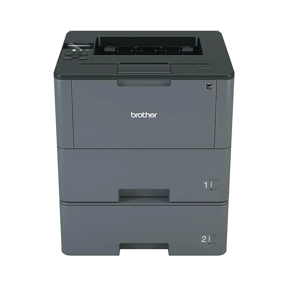 Handle daily paperwork needs with this monochrome laser printer. Dual 520-sheet trays deliver the capacity needed to take on high-volume print jobs, and speeds of up to 48 pages per minute (1) mean less time waiting for your documents to complete. This printer boasts a resolution of 1200 x 1200 dpi, providing crisp, clear text for better readability. With a one-line LCD display and simple controls, this laser printer offers effortless navigation. Use the Wi-Fi Protected Setup for one-touch wireless access, and create a network connection using the built-in Gigabit Ethernet. Mobile connectivity lets you send jobs from your tablet or smartphone, so there’s no need to transfer files before printing. The 50-sheet multipurpose tray and two standard trays let you print everything from envelopes to labels, making this Brother printer a versatile addition to your office.