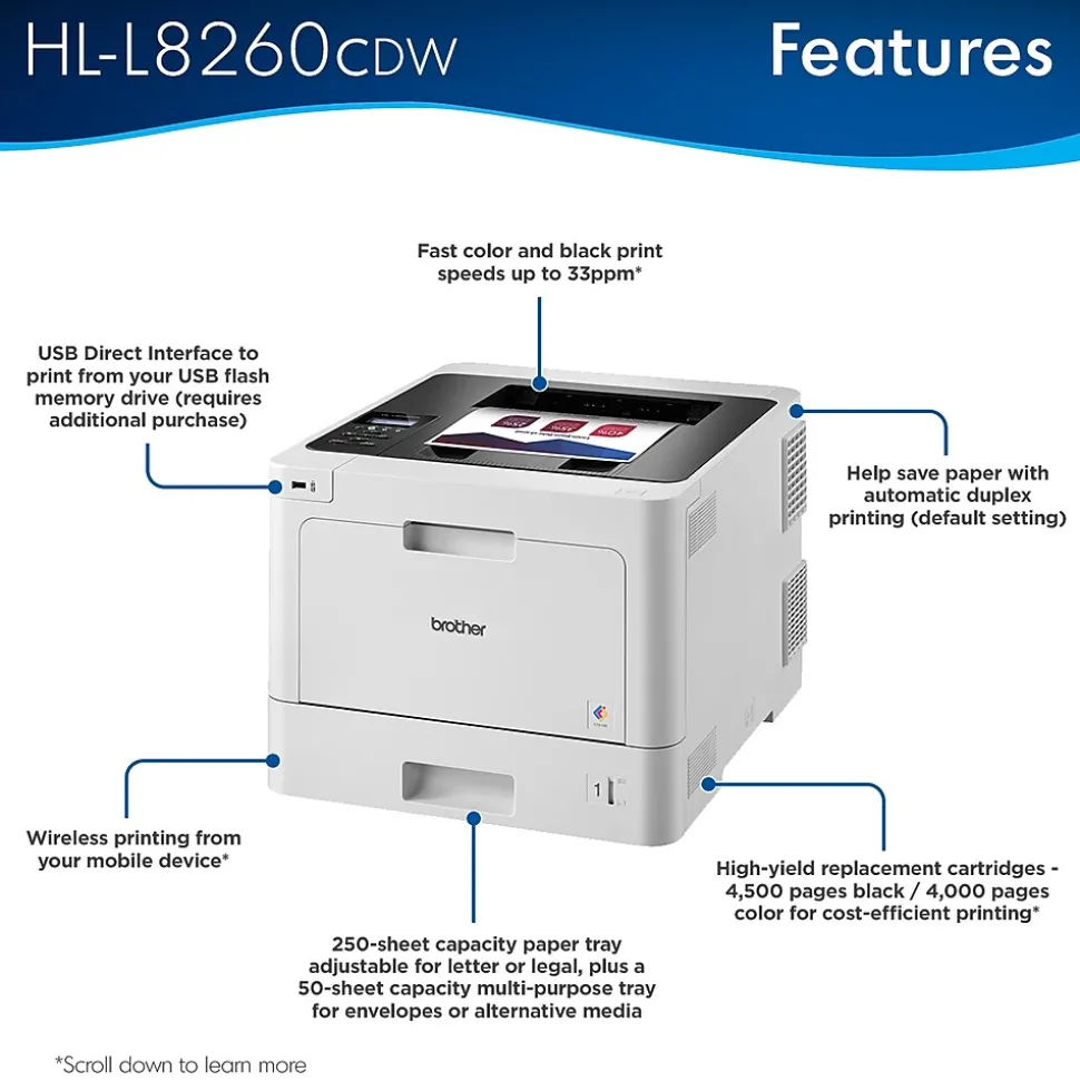- Shop with confidence, knowing your Brother HL-L8260CDW laser printer comes with a 1-year manufacturer limited warranty.