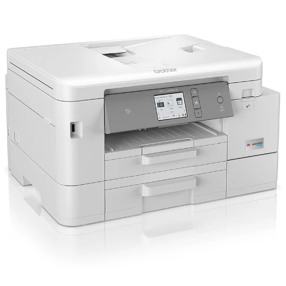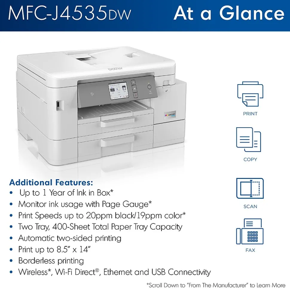 Print, copy, scan, and fax functionality, a generous 2.7″ touchscreen display, and two adjustable paper trays for up to a 400-page total capacity help make the Brother MFC-J4535DW all-in-one color inkjet printer the ultimate INKvestment Tank printer for your home, home office, schoolwork, or small business. Additional paper-handling options include an up to 20-sheet automatic document feeder for fast copying and scanning along with a bypass tray to handle a variety of media. The MFC-J4535DW also offers versatile connection options with NFC touch-to-print, built-in wireless, Wi-Fi Direct, Ethernet, or connect it locally to a single computer via USB interface. The MFC-J4535DW is supported by the Brother Mobile Connect app providing a convenient user interface that enables printing, scanning, copying, and device management from your smartphone or tablet. The MFC-J4535DW features fast print and scan speeds, along with the ability to wirelessly print, copy, and scan, along with duplex printing and enough ink for up to one year of printing with just the ink included in-box.