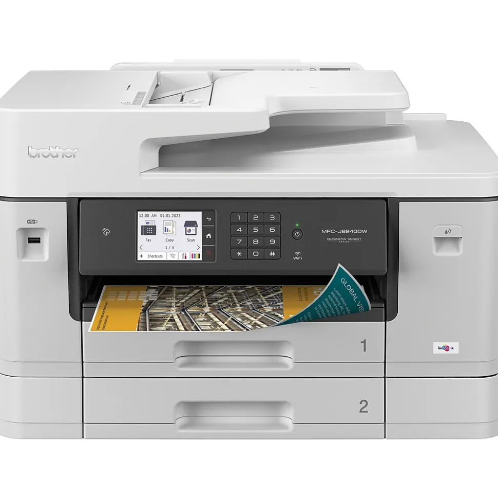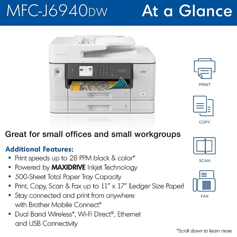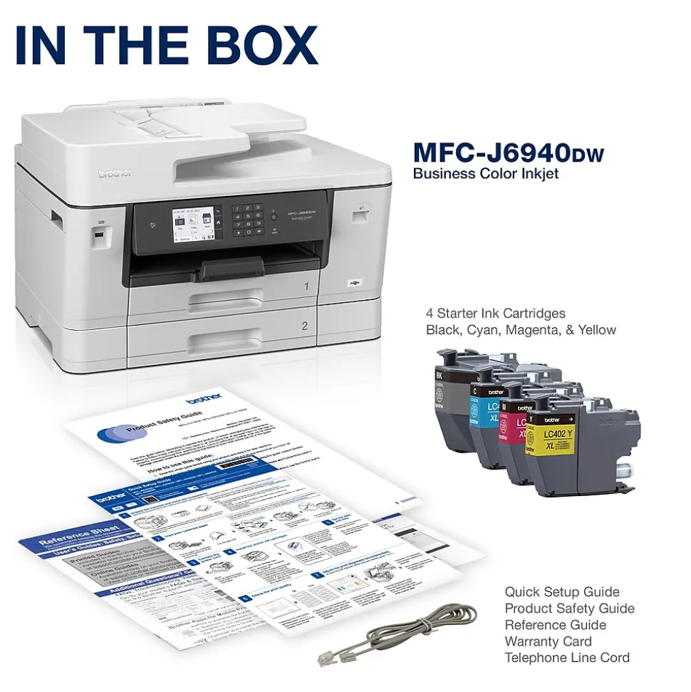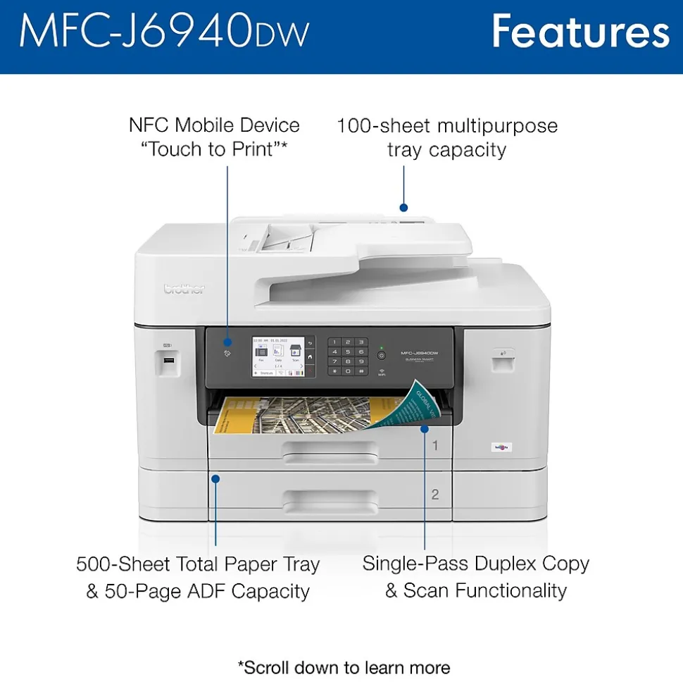 The Brother MFC-J6940DW color inkjet all-in-one printer delivers the functionality your office needs for optimum business performance. Print professional quality text and graphic documents at print speeds up to 28ppm(1) (black and color). A smart choice for businesses that need a printer to handle mixed media sizes; two, 250-sheet capacity paper trays(2) offer flexibility to print, copy, scan and fax on paper up to 11”x17″ (Ledger) size. Raising the bar with single-pass duplex copy and scan functionality. Use convenient NFC mobile printing(3) or access features on the go with the free Brother Mobile Connect App(4). Whether you print a little or a lot, our convenient Brother Refresh EZ Print Subscription Service erases the worry of running out of ink. The Brother MFC-J6940DW color inkjet All-in-One printer offers reliable, professional-quality printing for any small work group or small business.