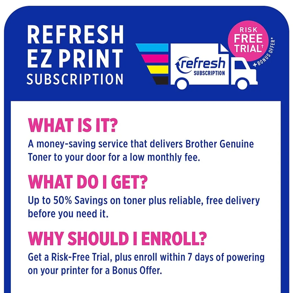 - Ensure optimal and uncompromising performance. When it’s time to replace your Toner, be sure to choose Brother Genuine TN730 Standard or TN760 High-Yield replacement cartridges. And with Refresh EZ Print Subscription Service, you’ll never worry about running out of Toner and enjoy savings of up to 50% on Brother Genuine Toner. Get started with Refresh today with a Free Trial.