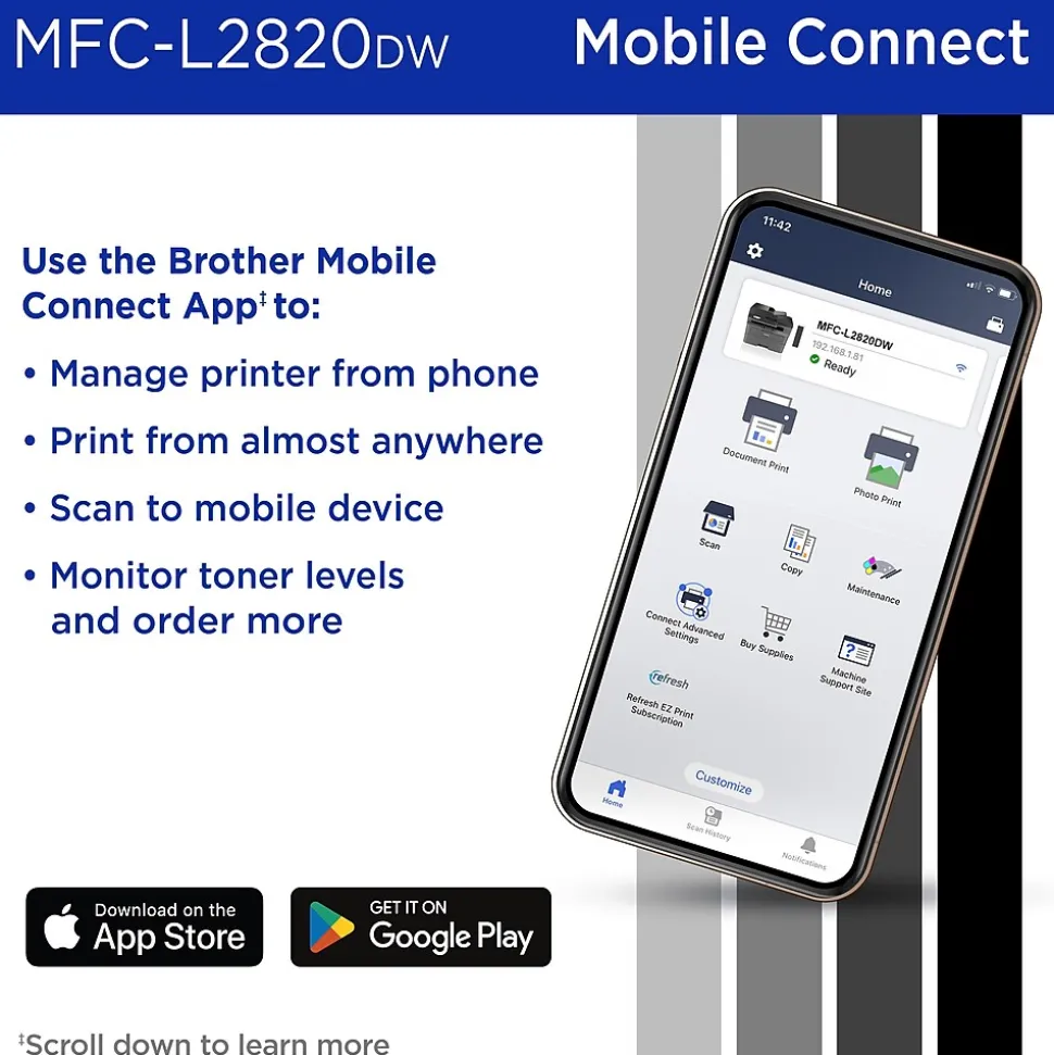 - PRINT FROM VIRTUALLY ANYWHERE. Print, scan, and manage your printer anytime, from almost anywhere with the Brother Mobile Connect app. Order Brother Genuine Supplies, track toner usage, and complete more work on-the-go.(7)