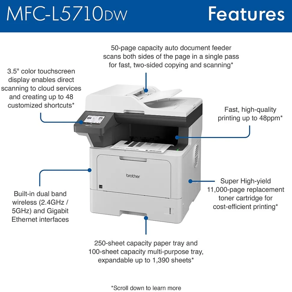 This high-performance all-in-one printer helps to increase productivity with fast print and copy speeds up to 48ppm(1). Delivers cost-efficient printing by using the Brother Genuine TN920XXL super high-yield replacement toner cartridge. Triple Layer Security features help to limit document and device access and protect against network intrusions. Offers expandable paper capacity that is scalable as your business needs grow. Quickly scan multi-page documents to a wide variety of destinations using the 50-page capacity(2) auto document feeder. The 3.5” touchscreen display allows for the creation of customized shortcuts to your most frequently used workflows. The MFC-L5710DW also provides flexible connectivity with built-in Gigabit Ethernet and dual band wireless networking, plus convenient mobile device printing to meet mobile workforce demands(3).