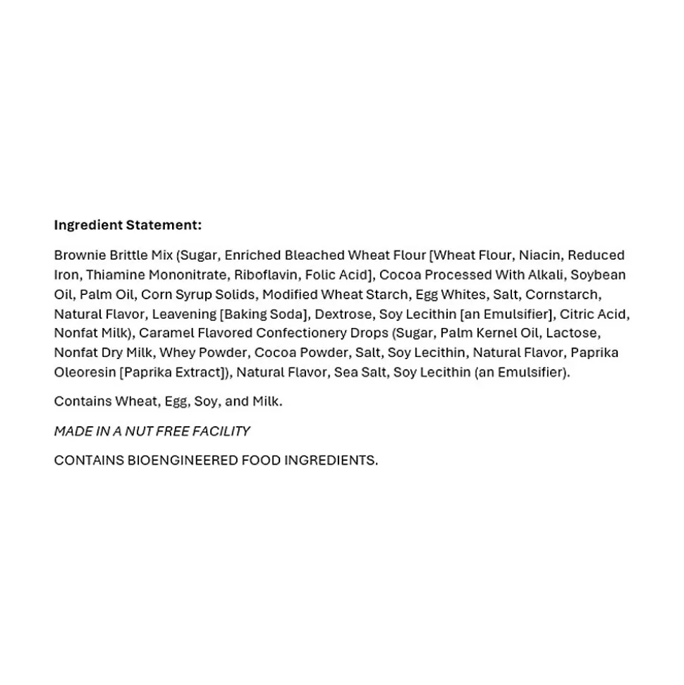 - Ingredients: brownie brittle mix (sugar, enriched bleached wheat flour, cocoa processed with alkali, soybean oil, palm oil, corn syrup solids, modified wheat starch, egg whites, salt, cornstarch, natural flavor, leavening, dextrose, soy lecithin, citric acid, nonfat milk), caramel-flavored confectionery drops (sugar, palm kernel oil, lactose, nonfat dry milk, whey powder, cocoa powder, salt, soy lecithin, natural flavor, paprika oleoresin), natural flavor, sea salt, soy lecithin