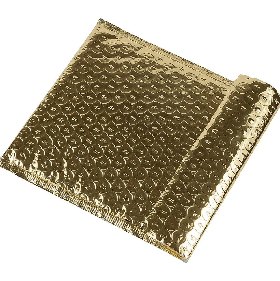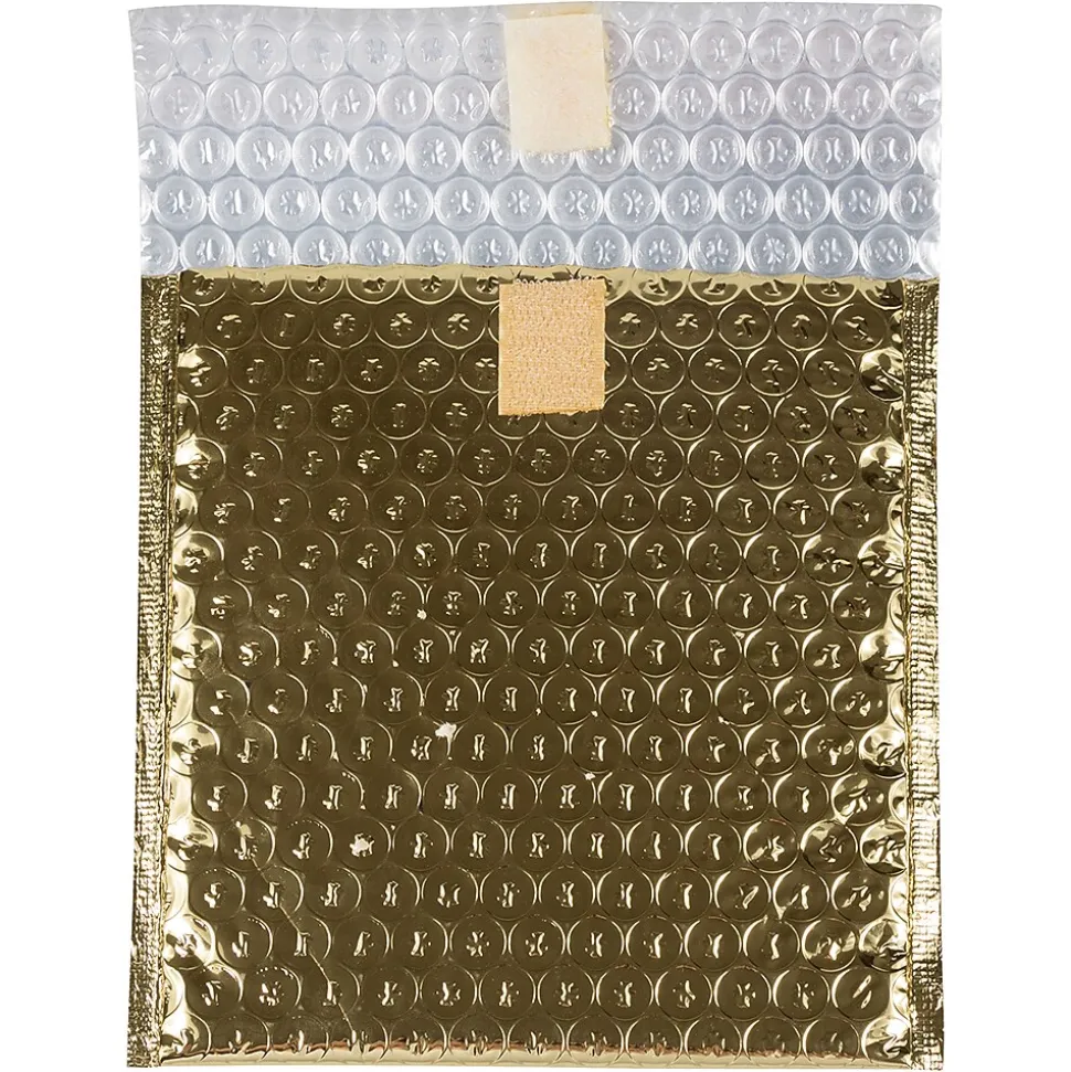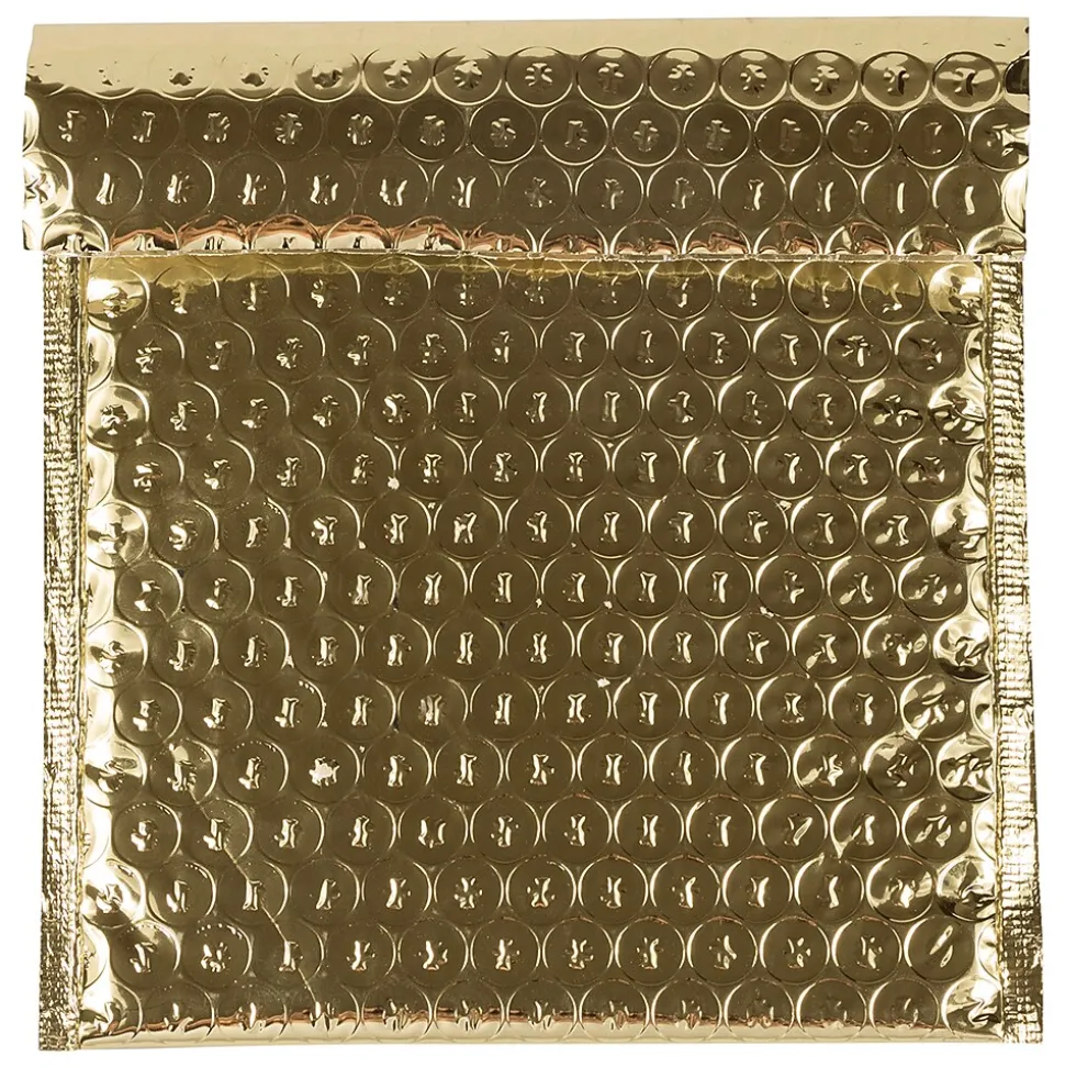 JAM PaperĀ® Gold Metallic CD Sized Bubble Mailers with Self Adhesive Closures are great for sending discs and other small narrow items through the mail with security and ease! These mailers are 6 x 6.5 inches in size and are sold in packs of 6. Each mailer is made of thin plastic, has a self-adhesive closure, and is lined with air-filled packing bubbles on the inside. Their shining gold color is sure to get them noticed as they travel through the mail and when they reach their destinations! Decorate, package, and protect your discs to be mailed all in one easy step with this golden bubble mailer!