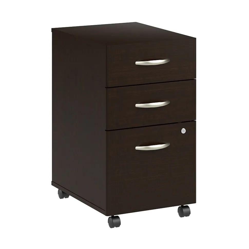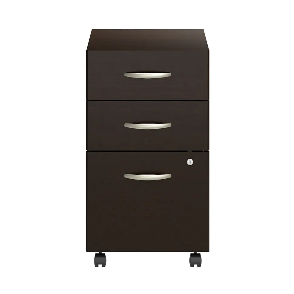 The Bush Business Furniture Arrive 3 Drawer Mobile File Cabinet presents an ideal way to add practical under desk storage to your reception area. Dual-wheeled casters allow the rolling file cabinet to move effortlessly throughout your space to provide convenient organization where it’s needed most. The file drawer opens on smooth full-extension ball bearing slides for an easy reach to letter, legal, and A4-size paperwork while two box drawers store writing utensils, notepads, and other small office supplies. A single lock secures the two bottom drawers to protect sensitive documents and valuable items. This commercial-grade portable filing cabinet has been meticulously tested to meet or exceed ANSI/BIFMA quality standards for safety, durability, and performance and is backed by the Bush Business Furniture 10 Year Manufacturer’s Warranty. American made with U.S. and imported parts.