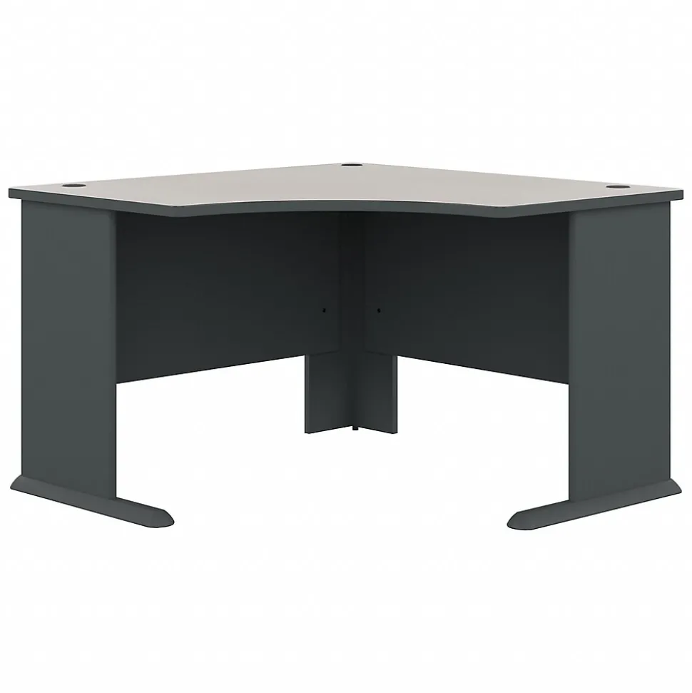 The Bush Business Furniture 48W Corner Desk maximizes your small office space with a convenient design and commercial-grade quality. Ideal for use in a corner, the Desk provides a comfortable curved work area, and a C-Leg design creates plenty of legroom. A scratch-resistant thermally fused laminate surface and thick end panels fend off damage, while sturdy feet with adjustable levelers ensure stability. Keep your cables in order with wire management grommets. The Corner Desk allows for easy configurations. Expand your work surface with coordinating Cubix Desks. Cubix offers a variety of layout options and multiple two-tone finishes. Backed by a 10 Year Warranty. American made with U.S. and imported parts.