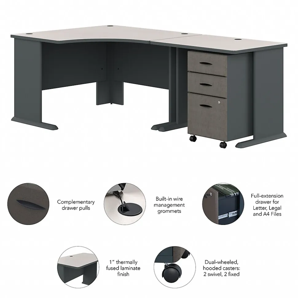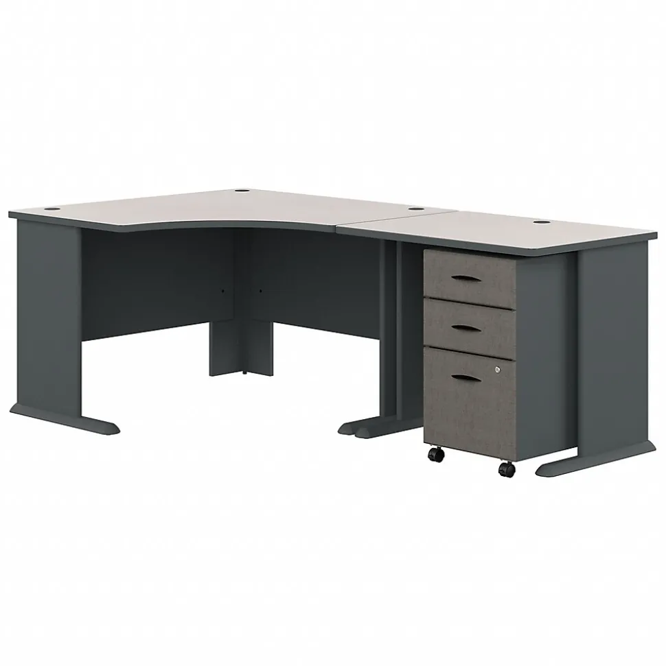 Work comfortably while saving space with this Bush Business Furniture Cubix 48W Corner Desk. Designed for placement in a corner, the Desk includes a comfortable curved work area and an open C-Leg design for added legroom. A 36W Desk expands the work surface, allowing you to spread out with your computer, paperwork and more, while wire management grommets keep cables out of your way. Depend on the scratch-resistant thermally fused laminate finish, thick end panels and rugged edge banding for years of professional quality. Roll the Mobile File Cabinet anywhere or leave it under the Desk to conserve floor space. A full-extension file drawer holds letter, legal and A4 documents while gliding on smooth ball bearing slides for an easy reach to the back. Cubix offers a variety of layout options and 7 finishes. Backed by a 10 Year Warranty. American made with U.S. and imported parts.