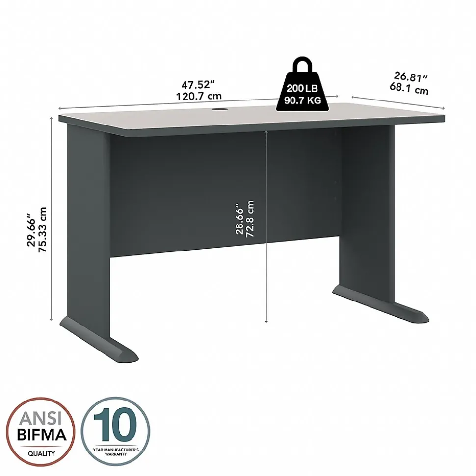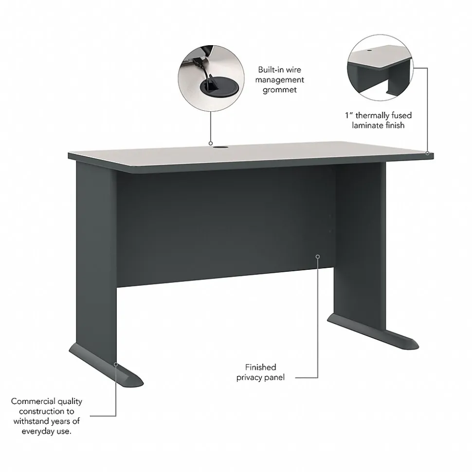The Bush Business Furniture Cubix 48W Desk provides lasting comfort and durability in a compact package. Perfect for a small office or as part of a larger workspace, the commercial-grade Desk features an open C-Leg design to maximize legroom. Thick end panels resist damage, while a thermally fused laminate surface fends off scratches and stains for a long-lasting professional appearance. Wire management grommets organize and secure computer cables to keep them out of your way. Sturdy Desk feet include encapsulated steel armature and adjustable levelers for use on all types of flooring. Cubix offers a variety of layout options and multiple two-tone finishes. Backed by a 10 Year Warranty. American made with U.S. and imported parts.