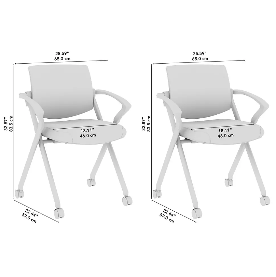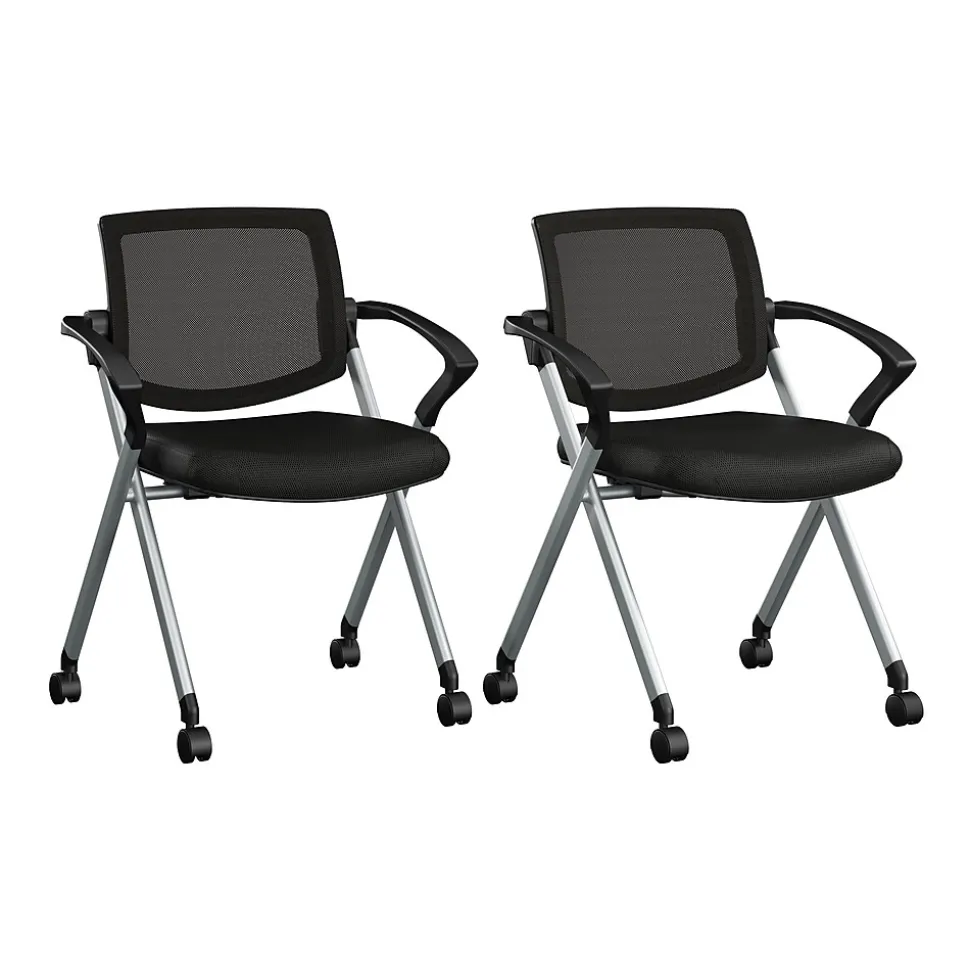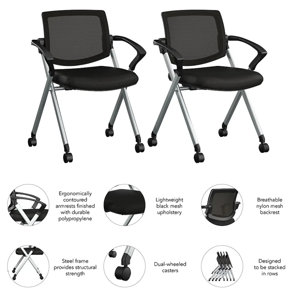 Enhance your meeting space with the Bush Business Furniture Envision Mesh Back Folding Chairs with Arms – Set of 2, designed for comfort and versatility, folding neatly away when not in use to save valuable space. The cushioned seat with lightweight black mesh upholstery offers long-lasting comfort with modern style. Simple, durable design is perfect for an office, conference center, training room, school or place of worship. Dual-wheeled casters allow the office chair set to be set up and rearranged at a moment’s notice. Steel frame provides structural strength with a weight capacity of 275 lbs., while the cushioned seat measures 18W x 18D. Bush Business Furniture’s commitment to safety includes rigorous testing that meets or exceeds ANSI/BIFMA 5.5 commercial test standards. Backed by a 5 Year Manufacturer’s Warranty.