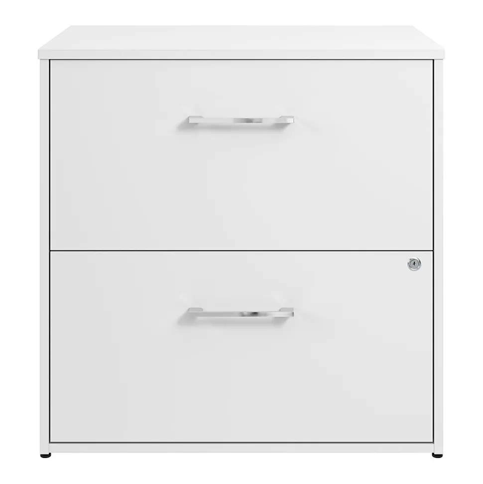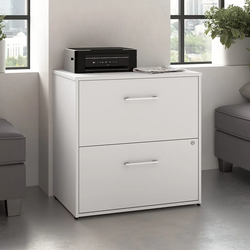 The Bush Business Furniture Hustle 2 Drawer Lateral File Cabinet provides the form and function needed to support your entrepreneurial spirit without breaking the bank. An ideal choice for small to medium-size businesses and home offices alike, the filing cabinet is a great way to keep letter, legal, and A4-size paperwork organized and accessible. Drawers open on smooth full-extension ball bearing slides for an easy reach to contents and are designed to extend one at a time for safety and stability. A single lock secures both drawers to safeguard sensitive documents as well as valuable items. Each drawer holds up to 60 pounds of materials. This 2 drawer file cabinet with lock has been meticulously designed and tested to meet or exceed ANSI/BIFMA standards for safety, durability, and performance and is backed by a 10 Year Manufacturer’s Warranty. American made with U.S. and imported parts.