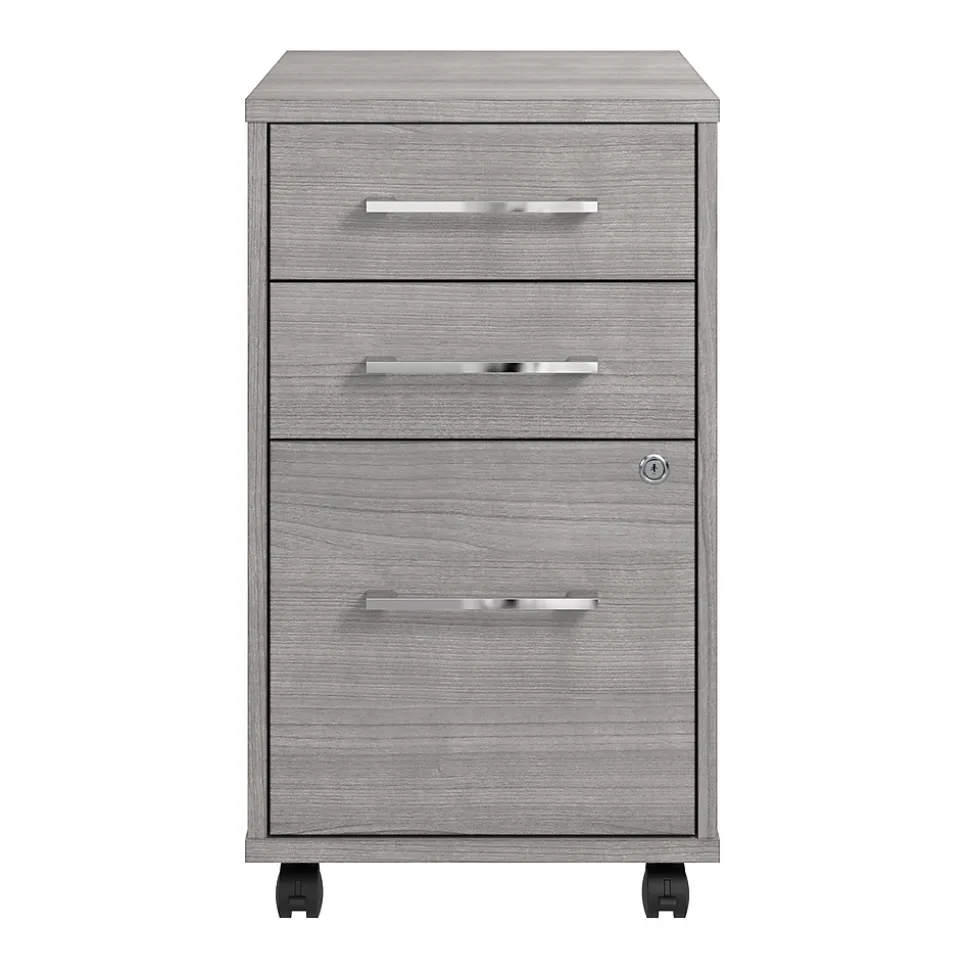 The Bush Business Furniture Hustle 3 Drawer Mobile File Cabinet provides the form and function needed to support your entrepreneurial spirit without breaking the bank. An ideal choice for small to medium-size businesses and home offices alike, the small filing cabinet rolls effortlessly throughout your workspace to provide storage where it’s needed most. The bottom drawer opens on smooth full-extension ball bearing slides for easy access to letter, legal, and A4-size paperwork while two box drawers organize writing utensils and other small office supplies. Drawers can be locked to safeguard sensitive documents as well as valuable items. This 3 drawer file cabinet with wheels has been meticulously designed and tested to meet or exceed ANSI/BIFMA standards for safety, durability, and performance and is backed by a 10 Year Manufacturer’s Warranty. American made with U.S. and imported parts.