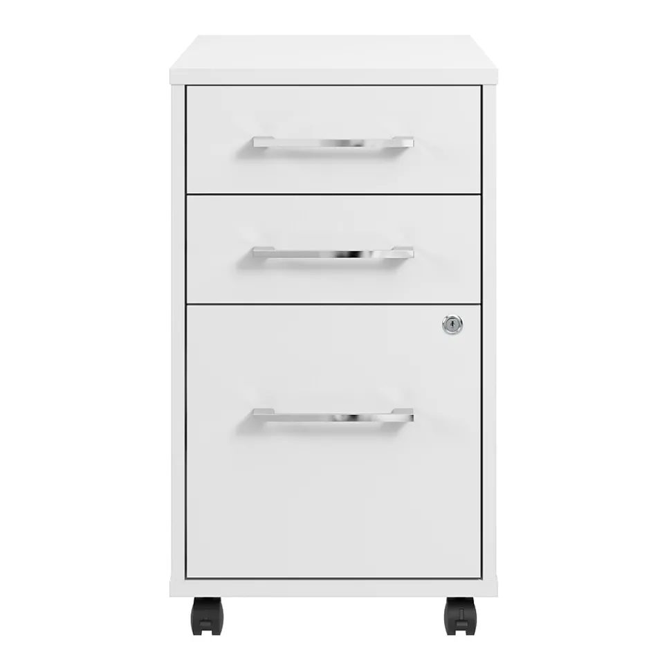 The Bush Business Furniture Hustle 3 Drawer Mobile File Cabinet provides the form and function needed to support your entrepreneurial spirit without breaking the bank. An ideal choice for small to medium-size businesses and home offices alike, the small filing cabinet rolls effortlessly throughout your workspace to provide storage where it’s needed most. The bottom drawer opens on smooth full-extension ball bearing slides for easy access to letter, legal, and A4-size paperwork while two box drawers organize writing utensils and other small office supplies. Drawers can be locked to safeguard sensitive documents as well as valuable items. This 3 drawer file cabinet with wheels has been meticulously designed and tested to meet or exceed ANSI/BIFMA standards for safety, durability, and performance and is backed by a 10 Year Manufacturer’s Warranty. American made with U.S. and imported parts.
