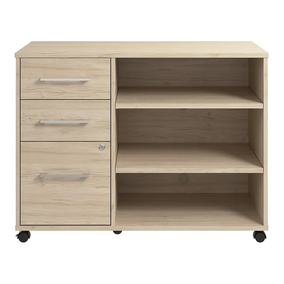 The Bush Business Furniture Hustle Office Storage Cabinet with Wheels provides the form and function needed to support your entrepreneurial spirit without breaking the bank. An ideal choice for small to medium-size businesses and home offices alike, the small cabinet rolls throughout your workspace to provide storage where it’s needed most. The left side features three drawers: one file drawer for letter, legal, and A4-size papers and two box drawers for small office supplies. Drawers can be locked to safeguard sensitive documents as well as valuable items. The office cabinet’s open storage area includes two adjustable shelves for work materials and equipment. This file cabinet with shelves has been meticulously designed and tested to meet or exceed ANSI/BIFMA standards for safety, durability, and performance and is backed by a 10 Year Warranty. American made with U.S. and imported parts.