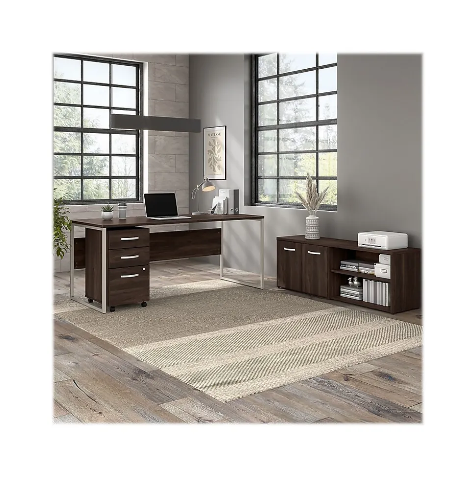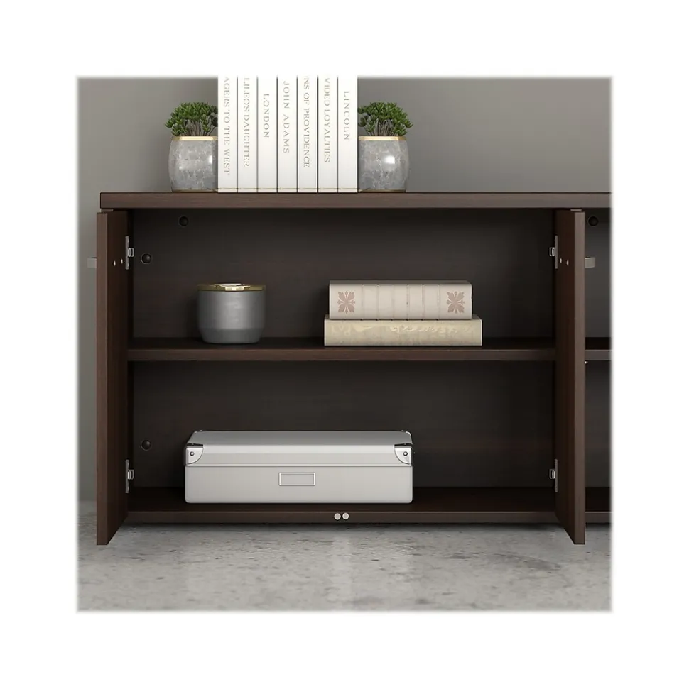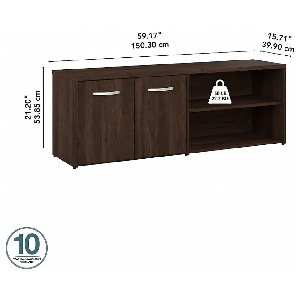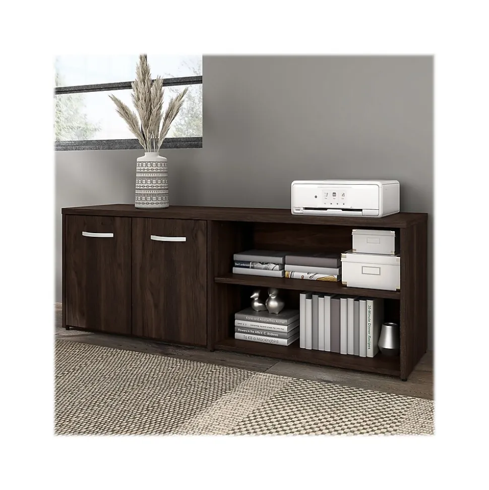 The Bush Business Furniture Hybrid low storage cabinet with doors and shelves offers a stylish, long-lasting workplace organization solution for the modern professional. Its open and closed compartments each include one fixed shelf and one adjustable shelf to accommodate everything from books and reference materials to decorations. Each shelf supports up to 50 lbs., so storing and displaying larger items is never an issue. The surface of the storage credenza can be used as a practical place to keep a small printer and other equipment or to give your workspace a personal touch with pictures, plants, and more. Find the perfect look for your space with five contemporary finish options: black walnut, modern hickory, platinum gray, storm gray, and white. This office credenza storage cabinet has been meticulously tested to meet or exceed ANSI/BIFMA quality standards for safety, durability, and performance and is backed by the Bush Business Furniture 10-year manufacturer warranty. See the full Hybrid collection for coordinating items to enhance your workspace as needed, including computer desks, file cabinets, and bookcases (coordinating items sold separately). American-made with US and imported parts.