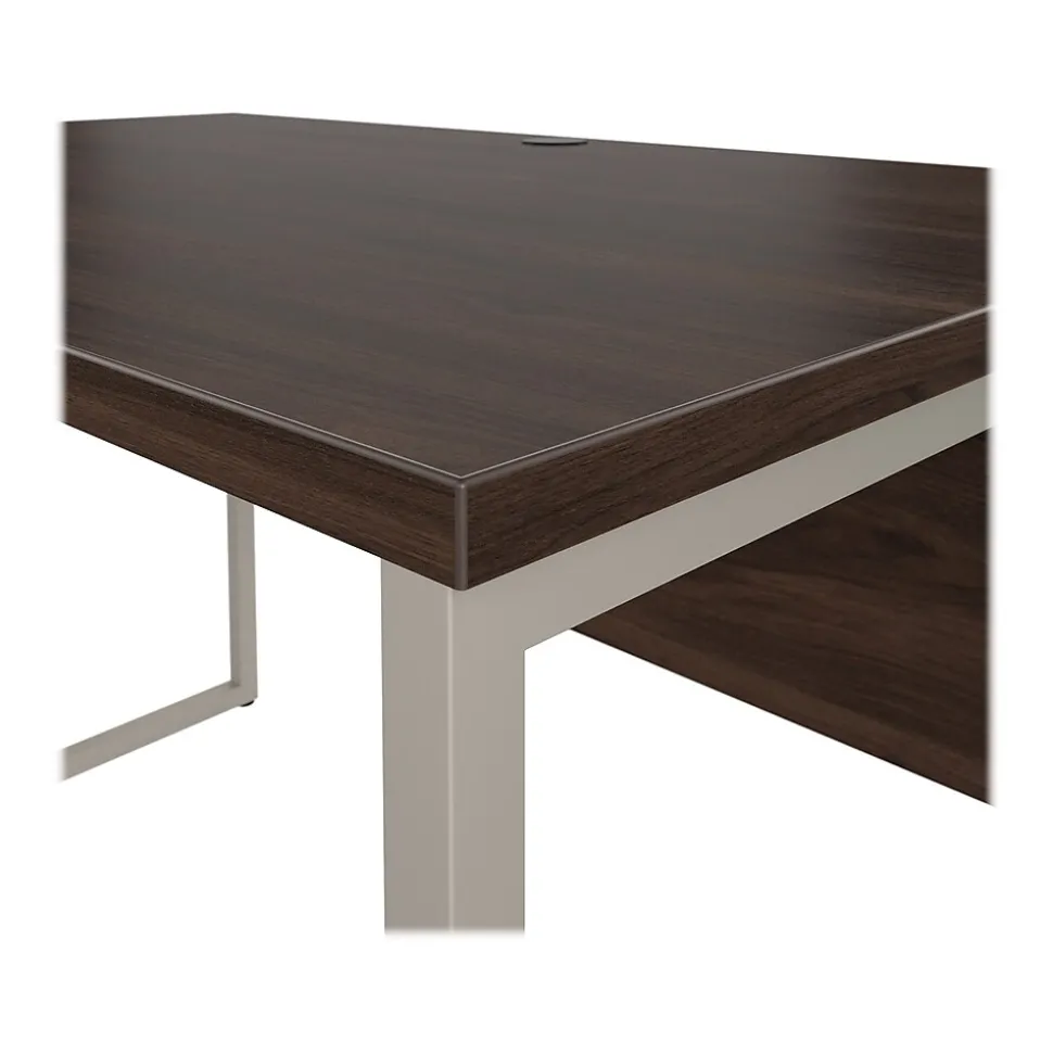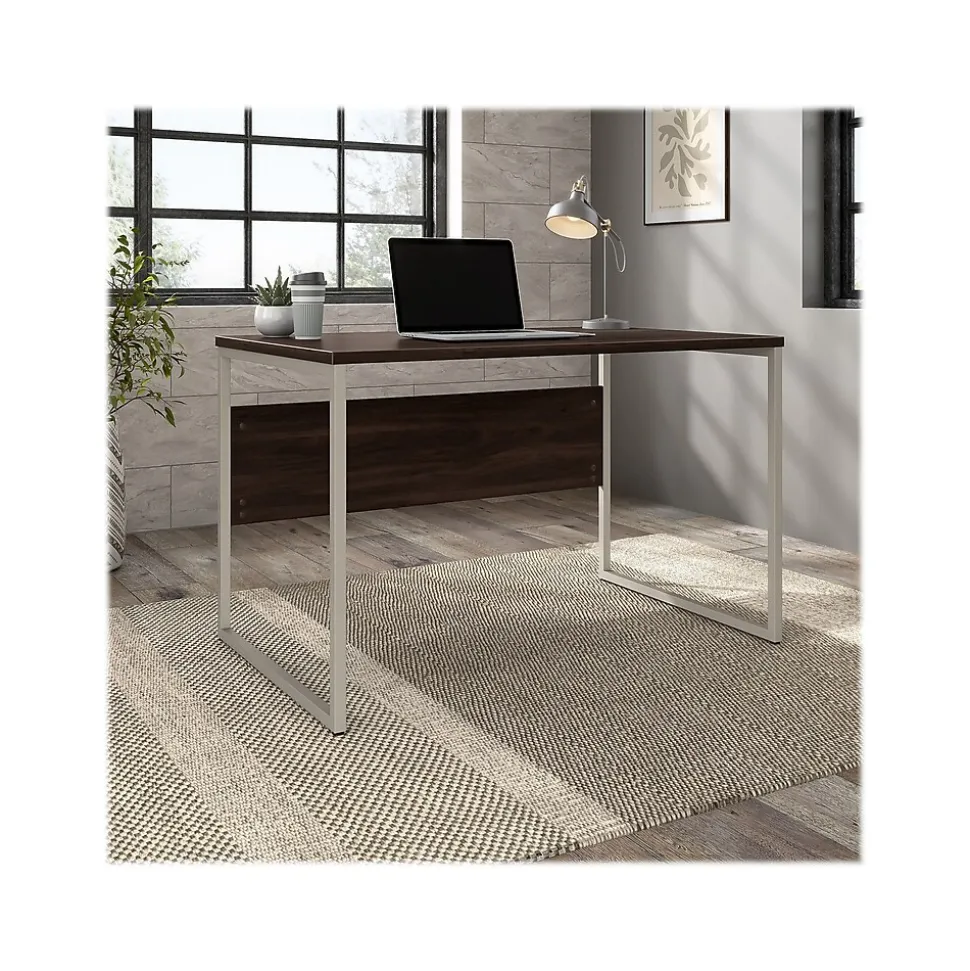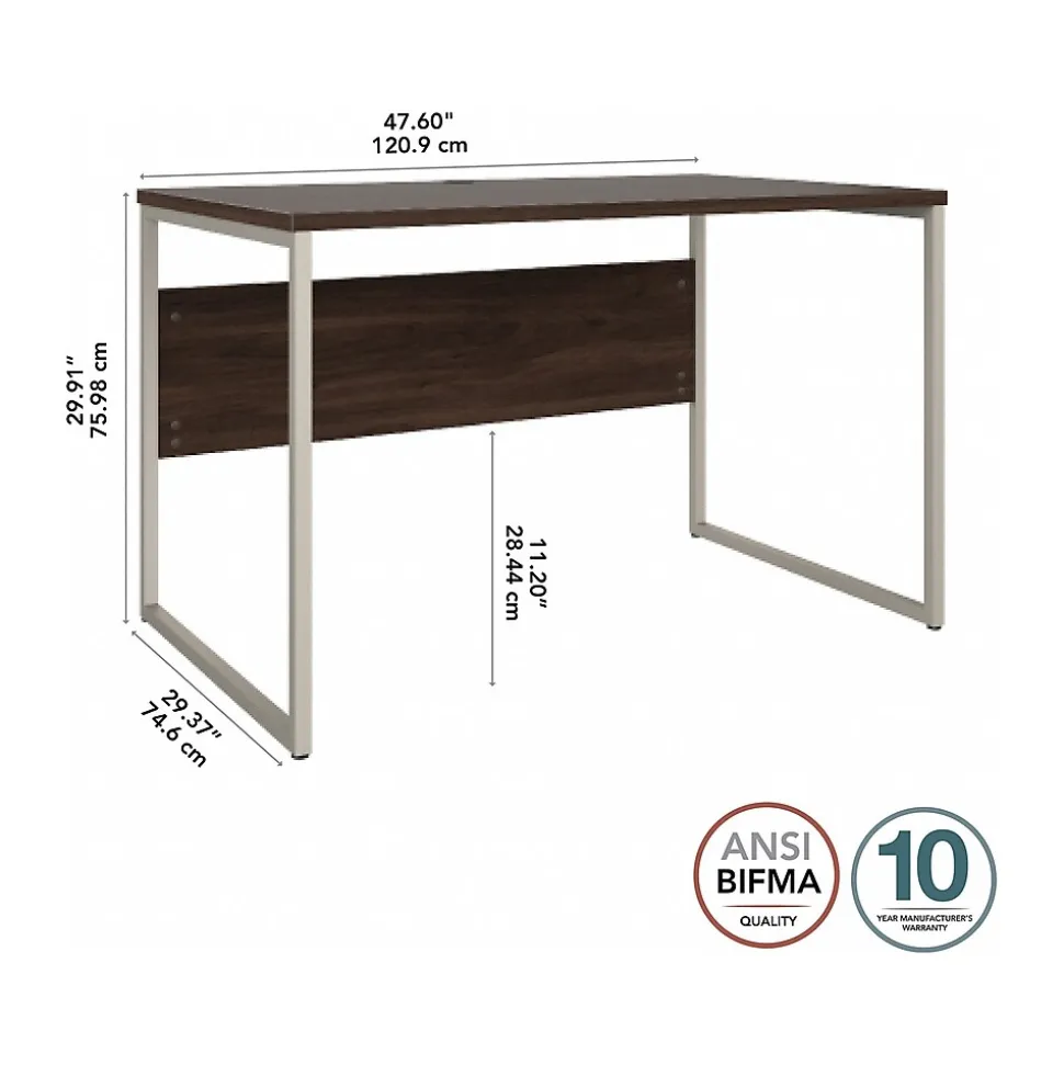The Bush Business Furniture Hybrid 48″W x 30″D computer table desk blends a durable work surface with sturdy metal legs to offer a stylish, long-lasting solution for the modern professional. Tackle your next project or assignment with a computer, books, paperwork, and more on a desktop that supports up to 200 lbs. A built-in wire management grommet keeps cords and cables in order, so your work area remains free from unnecessary clutter. The computer desk’s open leg design and finished privacy panel allow it to look great facing any direction in a home or professional office environment. Find the perfect look for your space with five contemporary finish options: black walnut, modern hickory, platinum gray, storm gray, and white. This modern desk has been meticulously tested to meet or exceed ANSI/BIFMA quality standards for safety, durability, and performance and is backed by the Bush Business Furniture 10-year manufacturer warranty. See the full Hybrid collection for coordinating items to enhance your workspace as needed, including file cabinets, bookcases, and storage cabinets (coordinating items sold separately). American-made with US and imported parts.