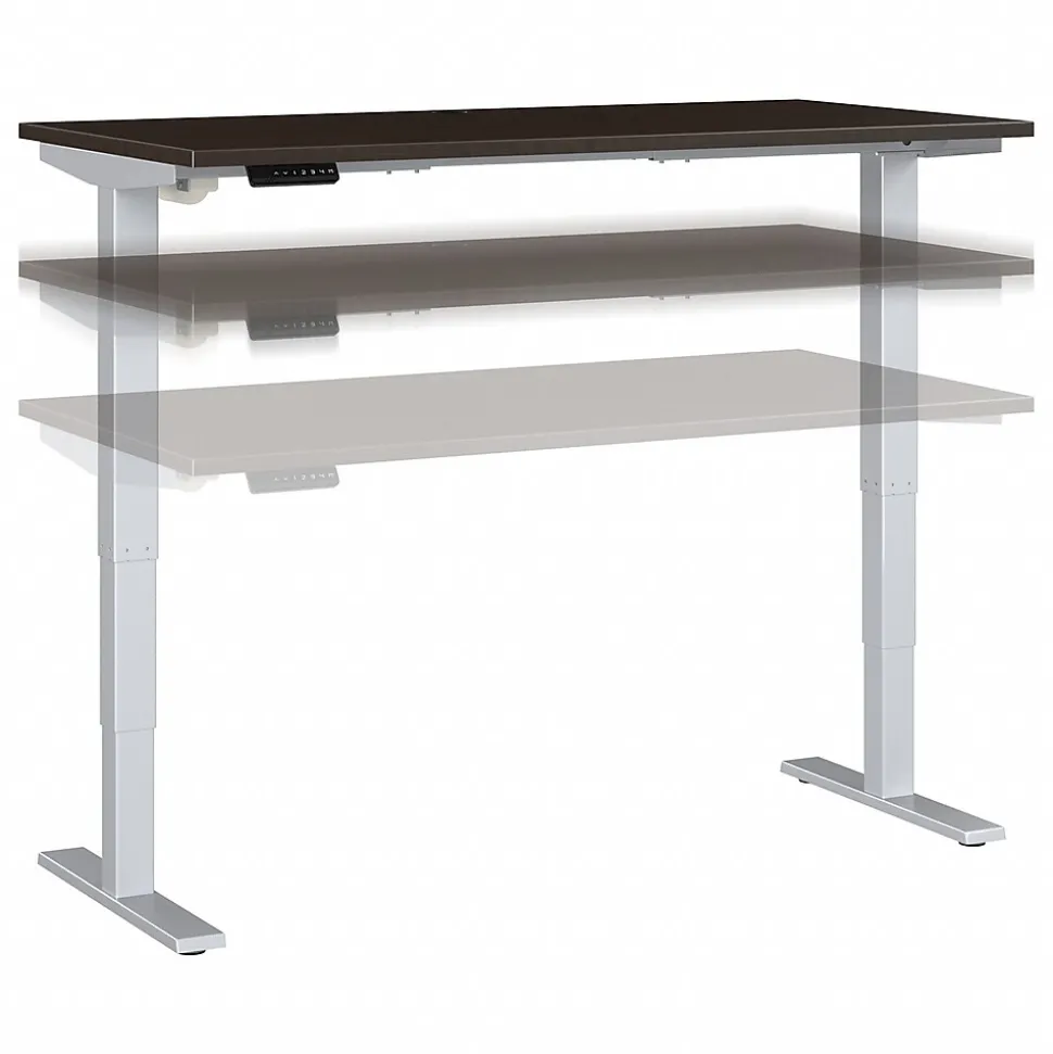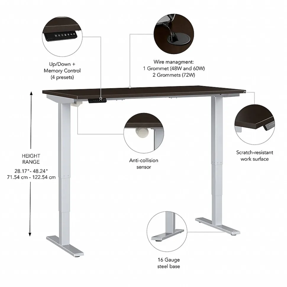 Bush Business Furniture’s Move 40 Series Electric Height Adjustable Standing Desk is a perfect way to build an ergonomic workspace without the high-end price tag. The 60W x 30D desktop lifts anywhere from 28 to 48 inches from the floor at a speed of 1.25 inches per second. The control panel includes four programmable presets that save your favorite heights so you can change positions without missing a beat. The Adjustable Desk also features an Anti-Collision Sensor that stops movement up or down if an object is detected. Built to endure the rigors of a busy professional environment, the thermally fused laminate work surface resists scratches and stains while a welded 16-gauge steel base allows the desktop to support up to 176 pounds. This Ergonomic Office Desk has been tested to meet or exceed ANSI/BIFMA standards for safety, durability and performance and is backed by a 5 Year Warranty.