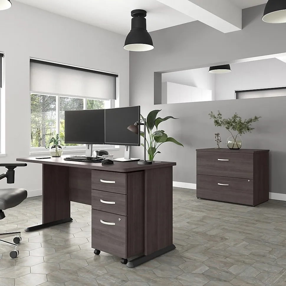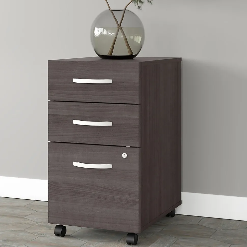 The Bush Business Furniture Studio A three-drawer mobile file cabinet combines a fresh contemporary appearance with the commercial-quality construction needed to withstand years of everyday use. The file drawer opens on smooth full-extension ball bearing slides for an effortless reach to letter-, legal-, and A4-size paperwork, while two box drawers organize writing utensils, notepads, and more. The two bottom drawers can be secured by a single lock to protect sensitive files and personal items. The rolling file cabinet’s compact design allows it to fit underneath a standard-size office desk for a space-saving configuration. This three-drawer file cabinet with wheels has been meticulously tested to meet or exceed the ANSI/BIFMA standards for safety, durability, and performance and is backed by the Bush Business Furniture 10-year manufacturer limited warranty. American-made with US and imported parts.