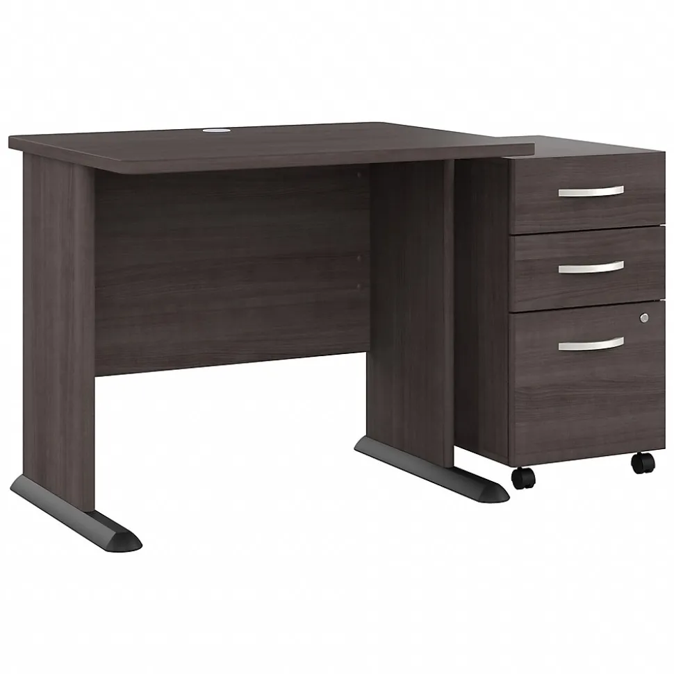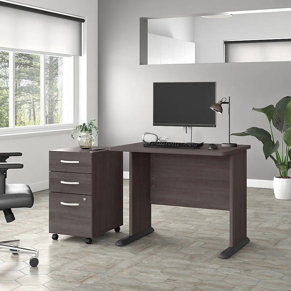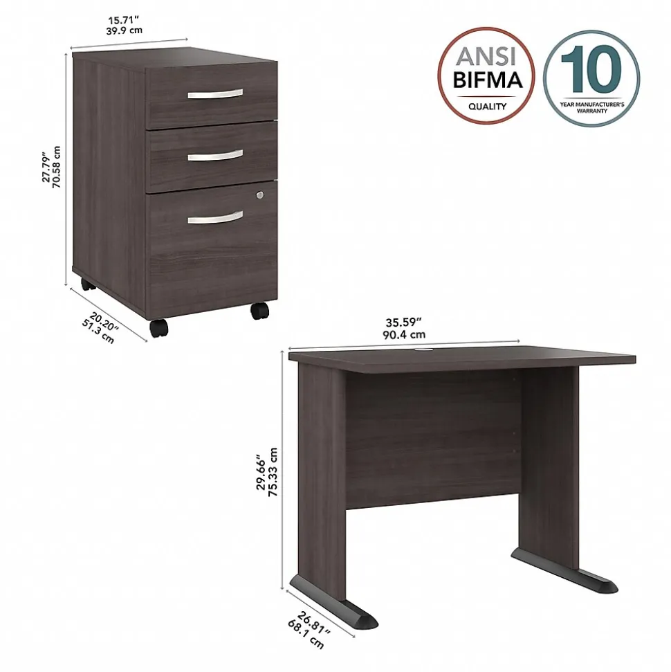 The Bush Business Furniture Studio A 36″W computer desk with three-drawer mobile file cabinet combines a fresh contemporary appearance with the commercial-quality construction needed to withstand years of everyday use. Set up with a computer and equipment on the durable thermally fused laminate desktop that supports up to 200 lbs. A built-in wire management grommet keeps cords and cables in order, so the surface remains free from unnecessary clutter. The file cabinet’s bottom drawer accepts letter-, legal-, and A4-size paperwork, while two box drawers organize supplies. The two bottom drawers can be locked to protect sensitive files and personal items. This small desk with drawers has been meticulously tested to meet or exceed the ANSI/BIFMA standards for safety, durability, and performance and is backed by a 10-year manufacturer limited warranty. American-made with US and imported parts.