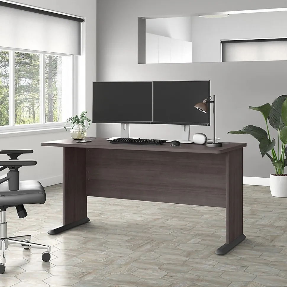 The Bush Business Furniture Studio A 60″W computer desk combines a fresh contemporary appearance with the commercial-quality construction needed to withstand years of everyday use. A spacious work surface makes this large desk a perfect choice for professionals and gamers who prefer having ample room to spread out. Set up with a computer and equipment on the durable thermally fused laminate desktop that supports up to 200 lbs. Two built-in wire management grommets keep cords and cables in order, so the surface remains free from unnecessary clutter. Wall attachment hardware is included for maximum safety and security in any home or professional office. This long desk has been meticulously tested to meet or exceed the ANSI/BIFMA quality standards for safety, durability, and performance and is backed by a 10-year manufacturer warranty. American-made with US and imported parts.
