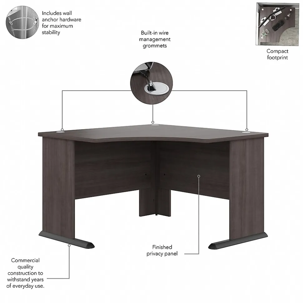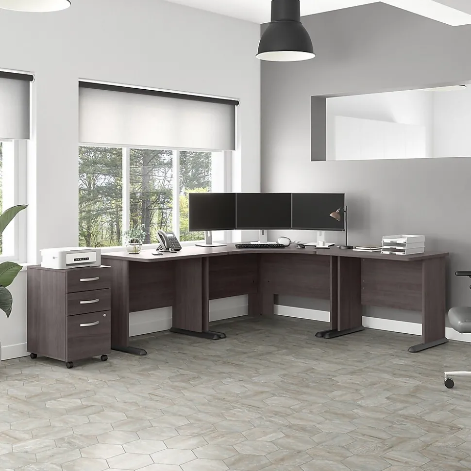 The Bush Business Furniture Studio A 83″W large corner desk with a three-drawer mobile file cabinet combines a fresh contemporary appearance with the commercial-quality construction needed to withstand years of everyday use. Set up with a computer and equipment on a durable thermally fused laminate desktop that supports up to 200 lbs. Five built-in wire management grommets keep cords and cables in order, so the surface remains free from clutter. The file cabinet’s bottom drawer accepts letter-, legal-, and A4-size paperwork, while a pair of box drawers organize supplies. The two bottom drawers can be locked to protect sensitive files and personal items. This corner computer desk with drawers has been meticulously tested to meet or exceed the ANSI/BIFMA standards for safety, durability, and performance and is backed by a 10-year manufacturer limited warranty. American-made with US and imported parts.