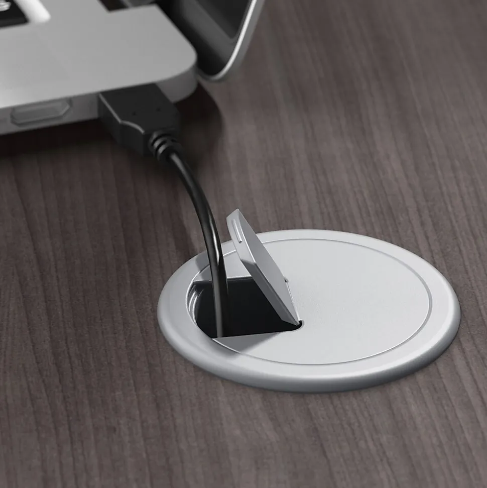 - Desk surface includes five built-in wire management grommets to keep cords and cables in order