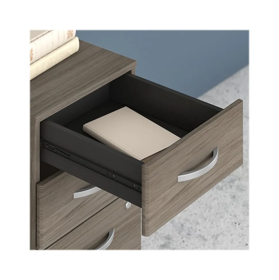 The Bush Business Furniture Studio C three-drawer mobile file cabinet rolls with you throughout your office or remains in place as needed on any surface. You’ll have your letter-, legal-, and A4-size paperwork organized in no time as the file cabinet ships fully assembled. Two box drawers hold your pens, notepads, and small office supplies. The file drawer opens on full-extension ball bearing slides, making it easy to reach papers at the back. Dual-wheeled, hooded casters keep the three-drawer cabinet moving on your floor or carpet. A single lock secures the bottom two drawers to protect sensitive paperwork and personal items. Eye-catching brushed nickel drawer pulls complement the beautiful finish. The mobile file cabinet comes with a 10-year manufacturer warranty and meets ANSI/BIFMA quality test standards. American-made with US and imported parts.