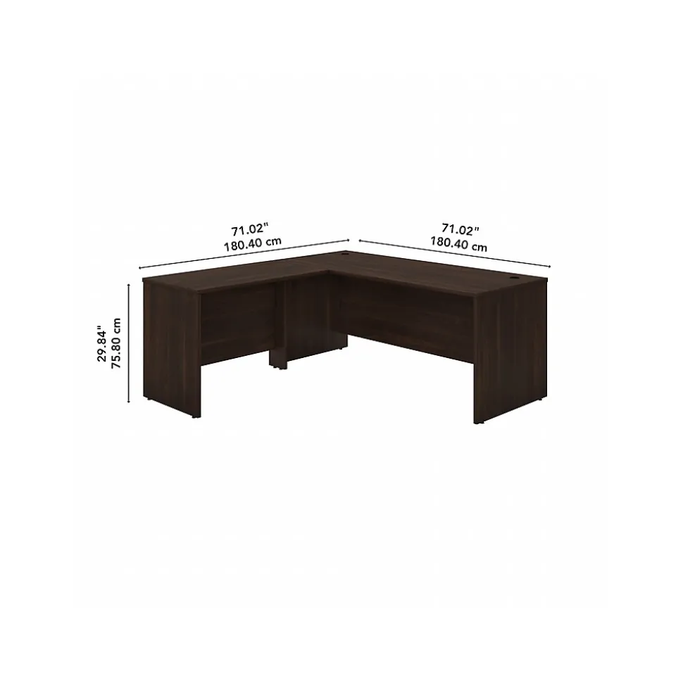 Highlighted by its contemporary style and commercial quality design, the Bush Business Furniture Studio C 72″W L-shaped desk with 42″W return presents a great workspace for a modern professional. Take advantage of the spacious surface to spread out with a computer, paperwork, and more as you tackle your next big project. The L-shaped desktop easily accommodates multiple monitors and other materials with a 200 lb. weight capacity and built-in wire management grommets. Position the L-shaped desk in a corner to save space in a small private office, or make use of the finished back to face outward in an open-plan environment. The return can be installed on either side of the main work surface for a right- or left-handed configuration. This corner desk is tested to meet ANSI/BIFMA standards for safety and performance and is backed by a 10-year manufacturer limited warranty. American-made with US and imported parts.