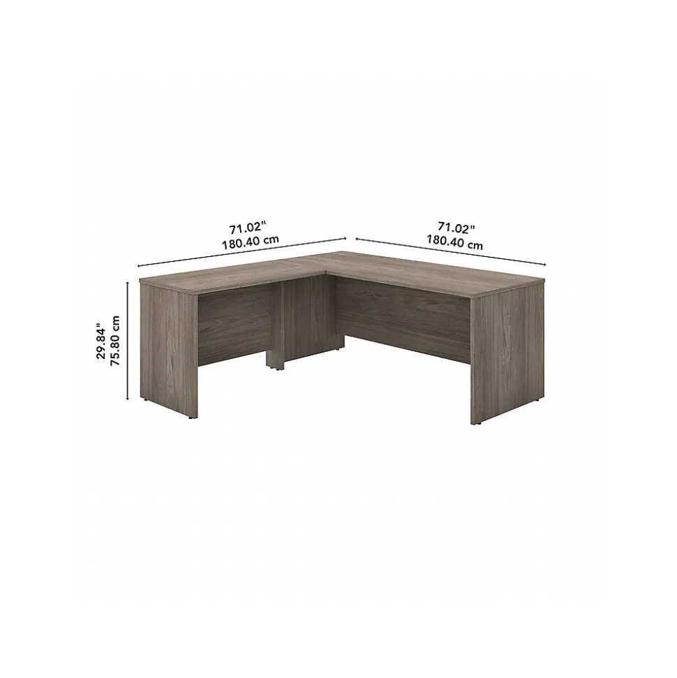 Highlighted by its contemporary style and commercial quality design, the Bush Business Furniture Studio C 72″W L-shaped desk with 42″W return presents a great workspace for a modern professional. Take advantage of the spacious surface to spread out with a computer, paperwork, and more as you tackle your next big project. The L-shaped desktop easily accommodates multiple monitors and other materials with a 200 lb. weight capacity and built-in wire management grommets. Position the L-shaped desk in a corner to save space in a small private office, or make use of the finished back to face outward in an open-plan environment. The return can be installed on either side of the main work surface for a right- or left-handed configuration. This corner desk is tested to meet ANSI/BIFMA standards for safety and performance and is backed by a 10-year manufacturer limited warranty. American-made with US and imported parts.