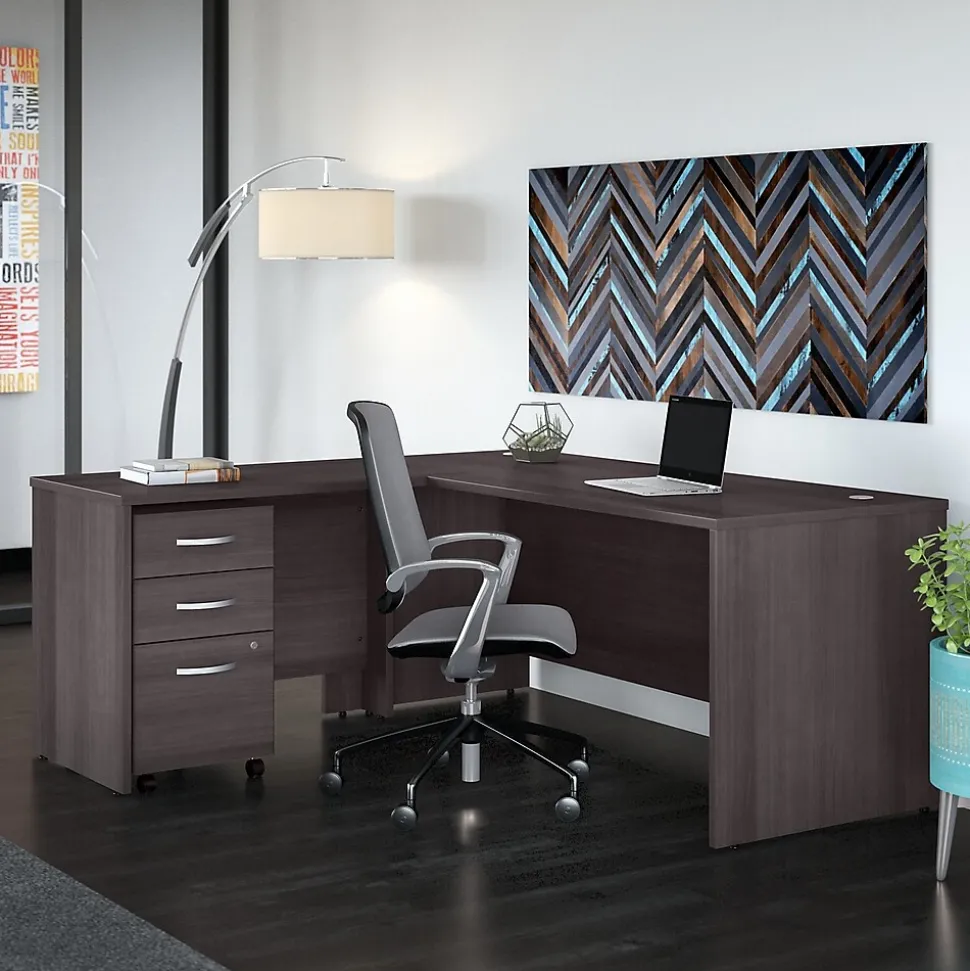 Highlighted by its contemporary style and commercial-quality design, the Bush Business Furniture Studio C 72″W L-shaped desk with 42″W return presents a perfect workspace for the modern professional. Take advantage of the spacious surface to spread out with a computer, paperwork, and more as you tackle your next big project. The L-shaped desktop easily accommodates multiple monitors and other materials with a 200 lb. weight capacity and built-in wire management grommets. Position the L-desk in a corner to save space in a small private office, or make use of the finished back to face outward in an open-plan environment. The return can be installed on either side of the main work surface for a right- or left-handed configuration. This corner desk is tested to meet ANSI/BIFMA standards for safety and performance and is backed by a 10-year warranty. American-made with US and imported parts.