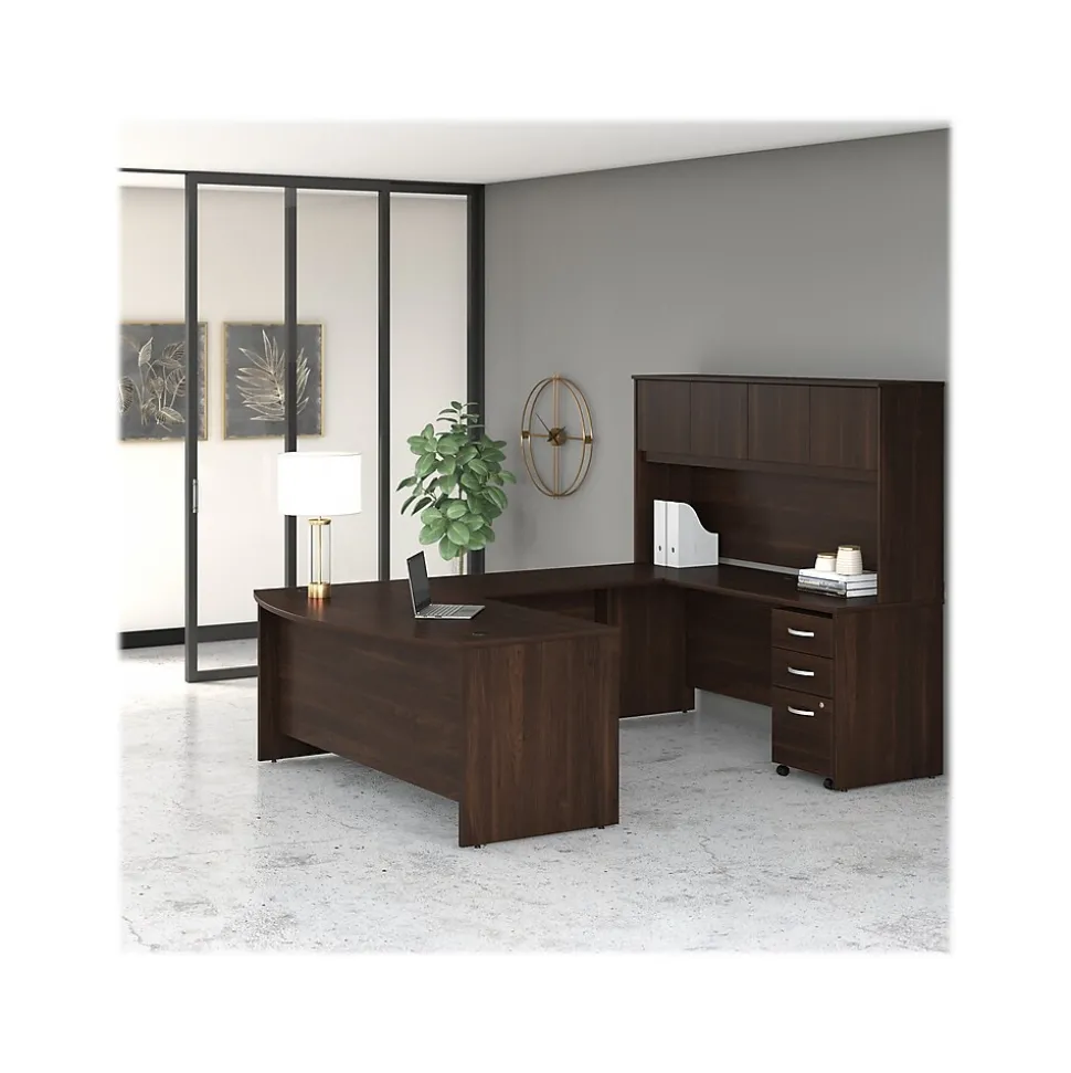 Give your office the workspace you need and the style you deserve with this Bush Business Furniture Studio C U-shaped desk with a hutch and mobile file cabinet. The extended bow front desk surface offers guests a rounded front to pull up a chair and collaborate, while the expansive U-shaped layout has all the room you could ever want to spread out. Featuring a thermally fused laminate finish, this office set stands up to years of everyday use. With four doors, the hutch stores office supplies, books, reference materials, and more. The three-drawer mobile file cabinet rolls with you throughout your office or remains in place as needed. One file drawer accepts legal-, letter-, and A4-size paperwork while two box drawers organize small office supplies. Studio C comes with a 10-year manufacturer warranty and meets ANSI/BIFMA standards. American-made with US and imported parts.