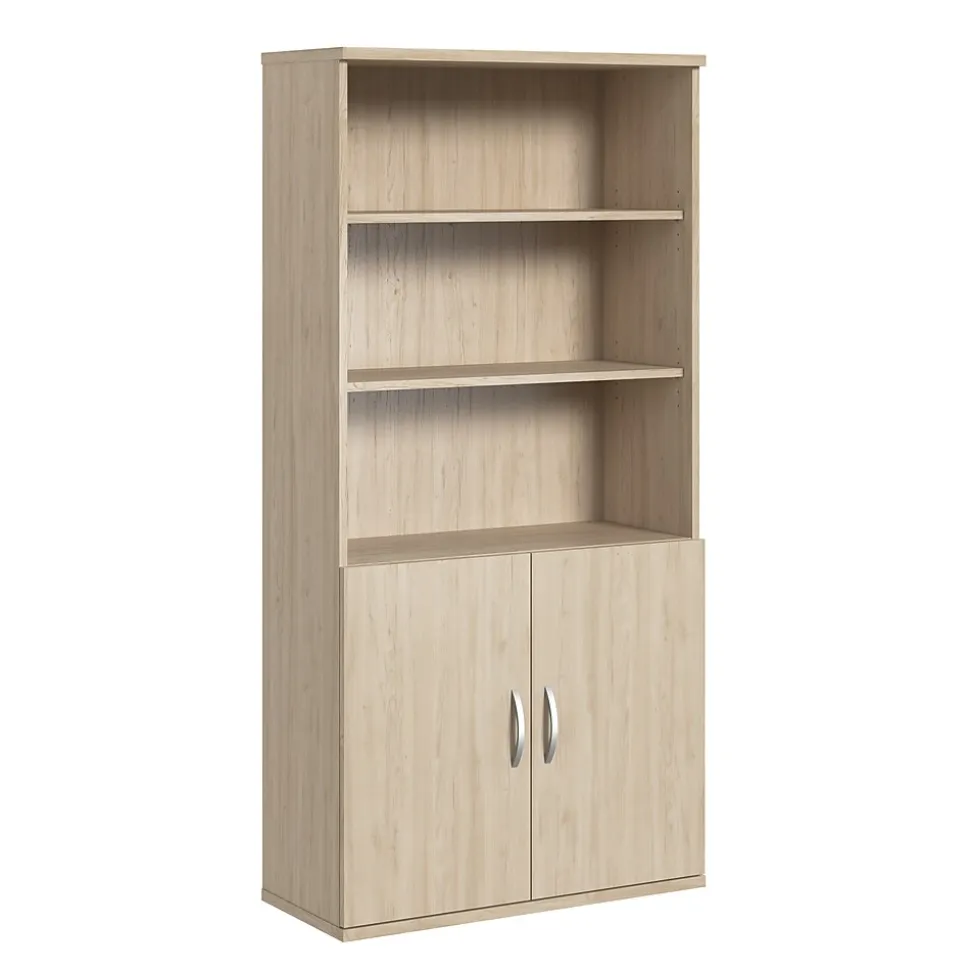 The Bush Business Furniture Studio C 5 Shelf Bookcase with Doors looks great, works hard and adjusts to fit the needs of your office. Designed with two fixed and three adjustable shelves, the Bookcase holds your books and reference materials with plenty of room for your favorite decorative accents. Confidently store a variety of items on the spacious and durable shelves, designed to hold up to 50 pounds each. A thermally fused laminate finish fends off everyday damage like scratches and stains throughout years of everyday use. Two doors with smooth Euro-style hinges conceal your office supplies and add an eye-catching touch to your workspace. This tall Bookcase with Doors comes with a 10 Year Warranty and meets ANSI/BIFMA quality test standards. See the full collection for coordinating items available to make your office your own with Studio C. American made with U.S. and imported parts.