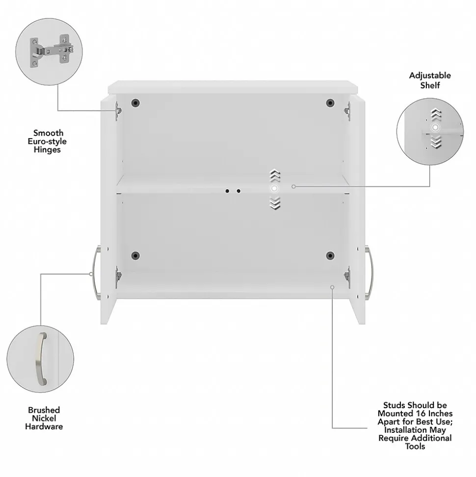 The Bush Business Furniture Universal wall cabinet with doors and shelves features a commercial-quality design and contemporary styling that suits virtually any home or professional environment. Organize your office, break room, garage, laundry room, or any other work or living space with a wall-mounted cabinet that’s built to last and boasts plenty of practical storage capacity. Cabinet doors with smooth Euro-style hinges open to reveal one fixed shelf and one adjustable shelf that accommodate office supplies, tools, and household items of various sizes. The total weight capacity of the small wall cabinet is 30 lbs. For best use, mount wall studs 16″ apart during installation. This wall storage cabinet has been tested to meet ANSI/BIFMA standards for safety and performance and is backed by a 10-year warranty. Complete your space with the full line of Universal modular storage solutions.