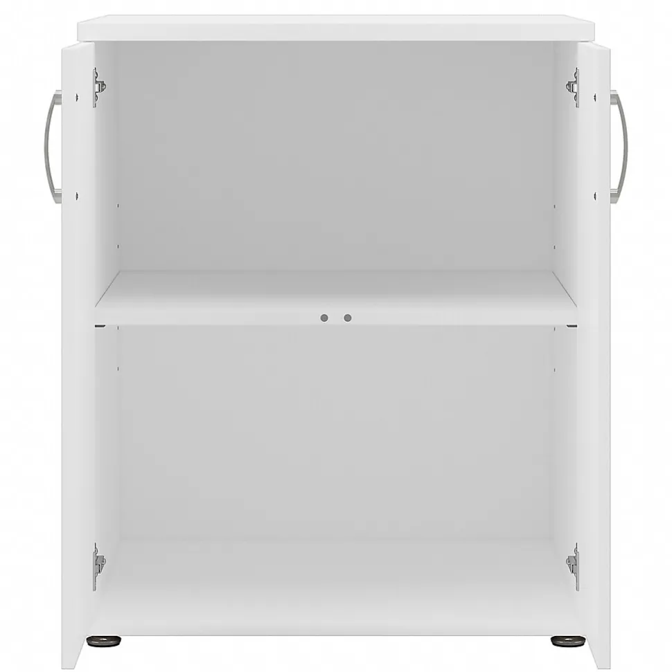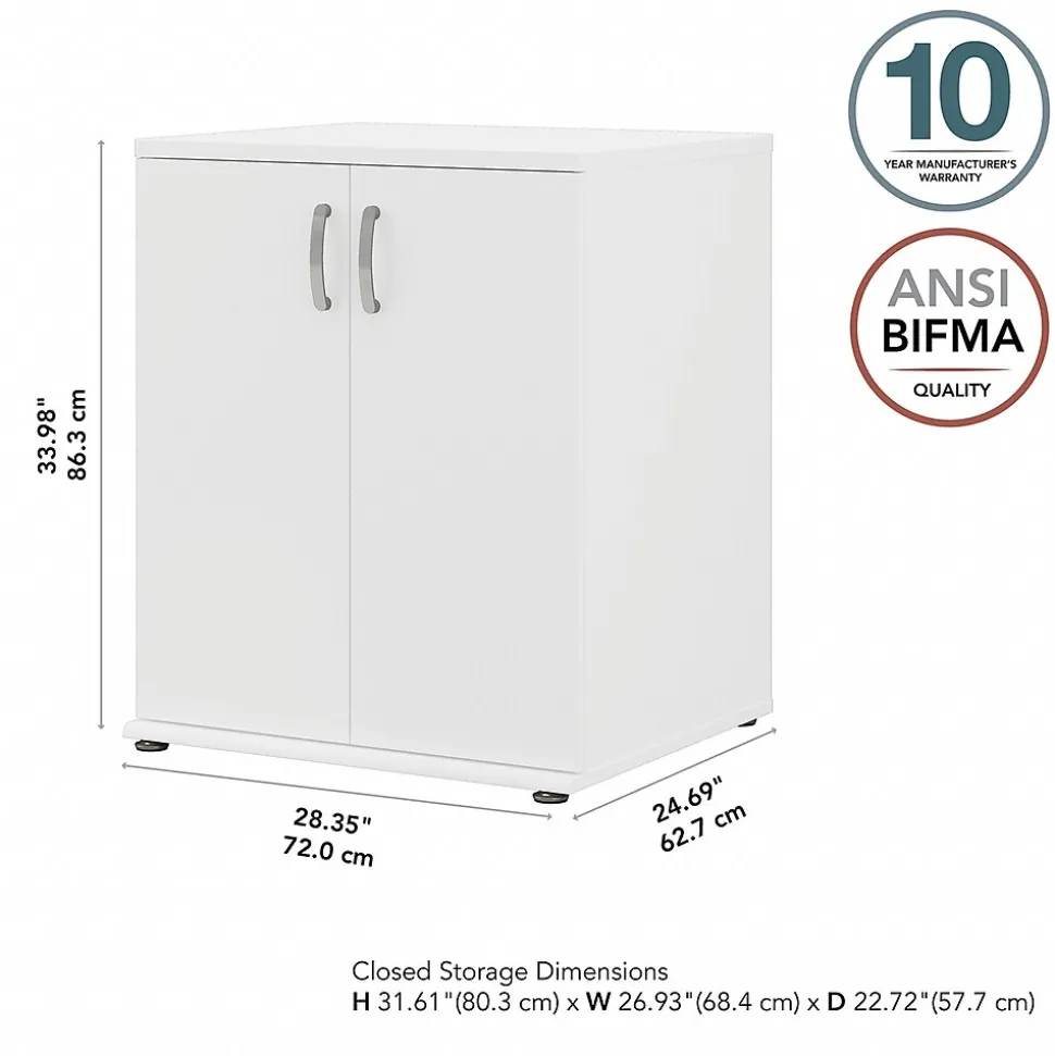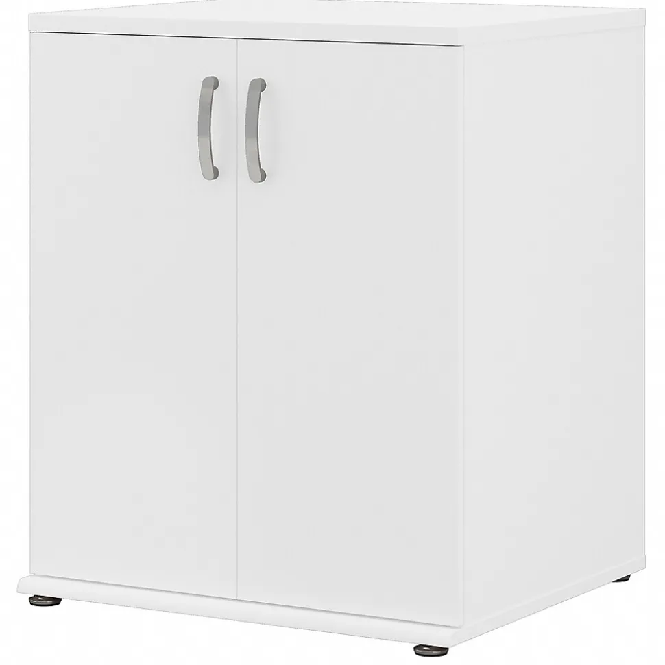 The Bush Business Furniture Universal floor storage cabinet with doors and shelves features a commercial quality design and contemporary styling that suits virtually any home or professional environment. Organize your office, break room, garage, laundry room, or another work or living space with an accent cabinet that’s built to last and boasts plenty of practical storage capacity. Cabinet doors with smooth Euro-style hinges open to reveal one fixed shelf and one adjustable shelf that accommodate office supplies, books, tools, and household items of various sizes. Each shelf supports up to 50 lbs., so storing larger materials is no problem. The floor cabinet’s base includes adjustable levelers to compensate for uneven surfaces. This two-door storage cabinet has been tested to meet ANSI/BIFMA quality standards for safety and performance and is backed by a 10-year manufacturer warranty.