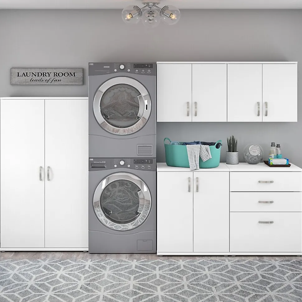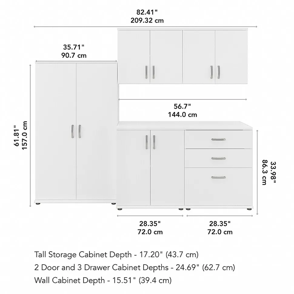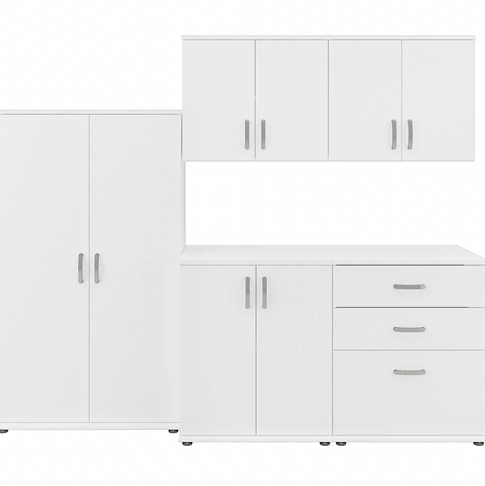 - Bundle includes: tall storage cabinet with doors, floor storage cabinet with doors, floor storage cabinet with drawers, and two wall cabinets with doors