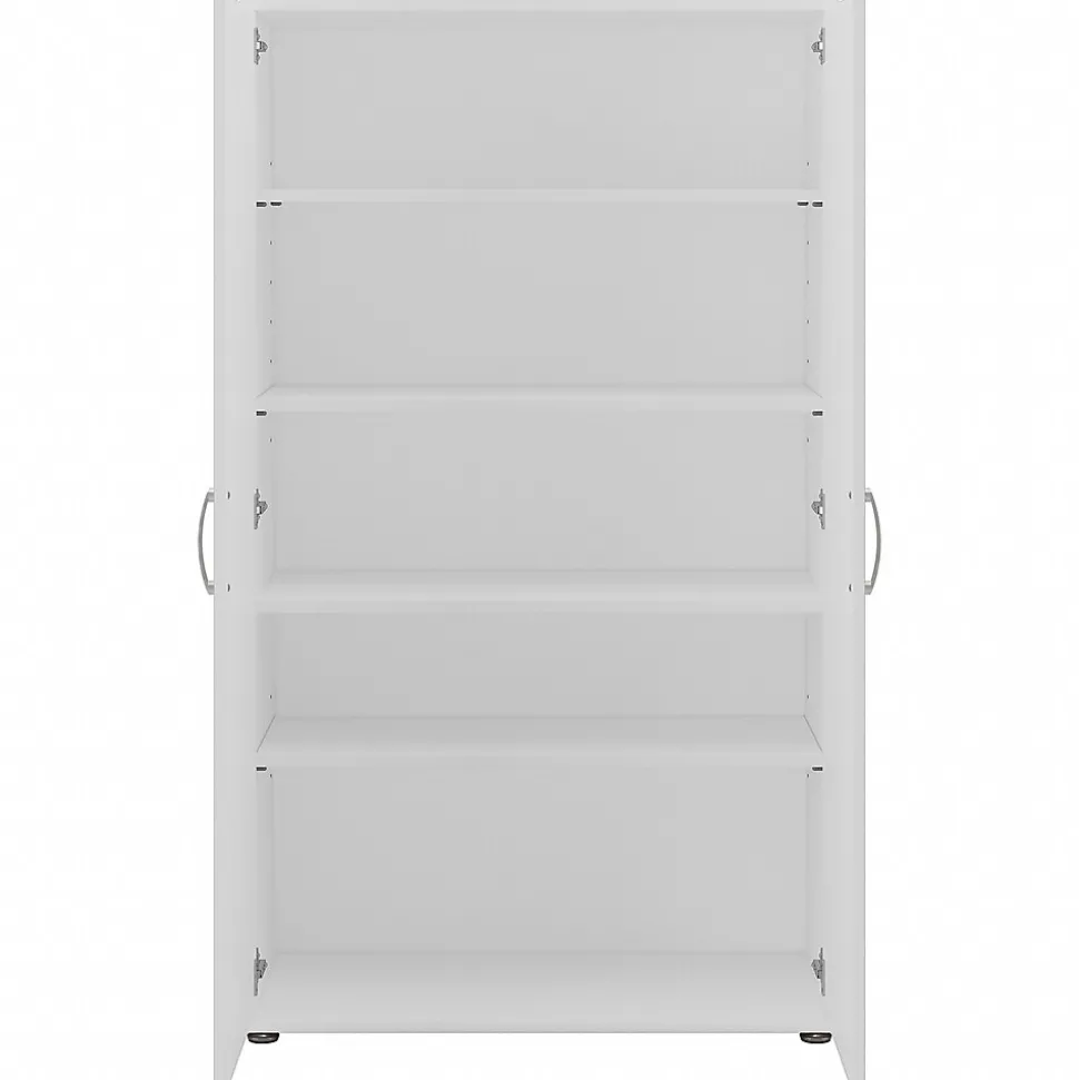 The Bush Business Furniture Universal five-piece modular storage set with floor and wall cabinets features commercial-quality designs and contemporary styling that suits virtually any home or professional environment. Organize your office, break room, garage, laundry room, or another work or living space with storage furniture that’s built to last and offers plenty of room for supplies, materials, and equipment. Both the floor storage cabinet with doors and tall storage cabinet combine fixed and adjustable shelving to accommodate items of various sizes. Two wall-mounted cabinets also contain one fixed and one adjustable shelf each for flexible, space-saving storage. Additional office supplies, tools, and household items can be stashed inside the three-drawer cabinet. This cabinet set has been tested to meet ANSI/BIFMA standards for safety and performance and is backed by a 10-year warranty.