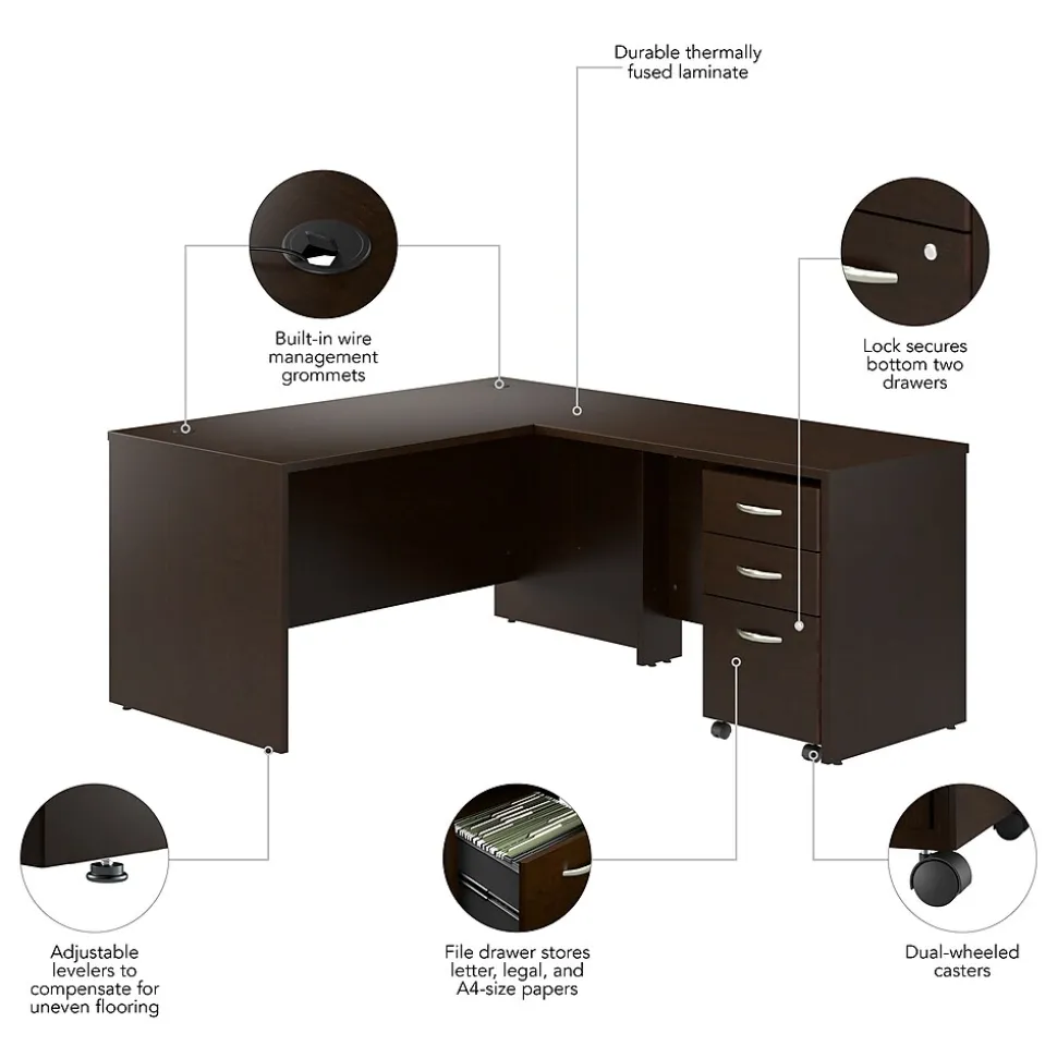 The Bush Business Furniture Westfield 60W L Shaped Desk with 42W Return and Mobile File Cabinet offers a commercial quality workspace solution with the style and functionality today’s professionals demand. The desktop easily accommodates multiple monitors and other materials with a 200-pound weight capacity and built-in wire management grommets. The return can be installed on either side of the main work surface for a right or left-handed configuration, giving this L shaped computer desk the ability to adapt to any office layout. The rolling file cabinet’s lower drawer accepts letter, legal, and A4-size paperwork while two box drawers organize writing utensils and other small office supplies. This L shaped office desk with drawers is tested to meet or exceed ANSI/BIFMA standards for safety and performance and is backed by a 10 Year Warranty. American made with U.S. and imported parts.