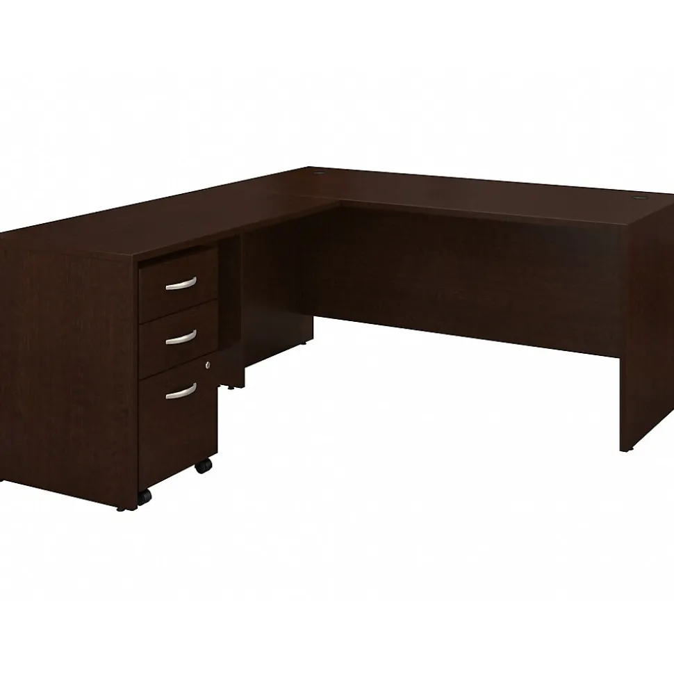 Spread out and save space with this Bush Business Furniture Series C L-shaped desk. 66″W and 48″W work surfaces offer ample room for your computer, phone, assignments and more, while the thermally fused laminate finish resists scratches and stains. Feed cables through wire management grommets in the desk surface and modesty panel to keep them out of your way. The mobile file cabinet rolls wherever you need it or fits conveniently underneath the L-shaped desk to conserve floor space. Clean lines, brushed nickel hardware, and extended modesty panels provide a professional appearance. Bush Business Furniture Series C offers endless layout options, expansion opportunities, and seven finishes. This affordable office furniture withstands the rigors of a 40-plus-hour work week and comes with a 10-year manufacturer warranty. American-made with US and imported parts.