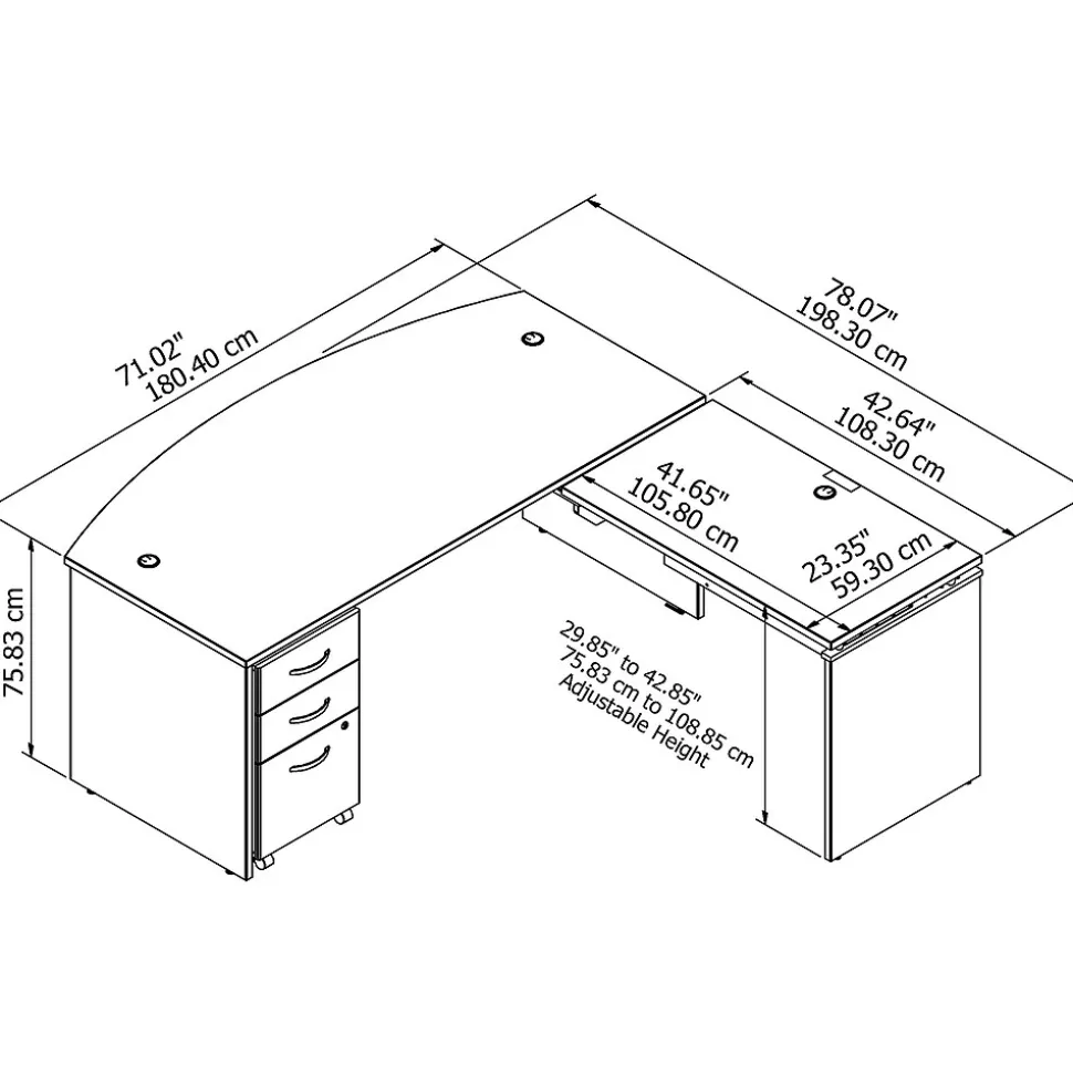 - Bundle includes: 72W x 36D Bow Front Desk, 42W x 24D Sit to Stand Return, 3 Drawer Mobile File Cabinet