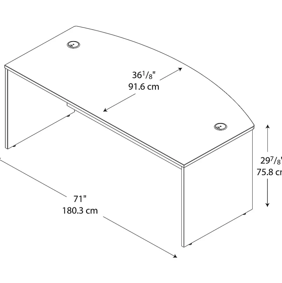 Spread out with all of your work on this Bush Business Furniture Westfield Bow Front Desk and have space to spare for collaboration. The expansive 72W surface provides plenty of room for your laptop, phone and paperwork, along with wire management grommets to conceal cables. The rounded Bow Front Desk gives guests an extended workspace to pull up chairs and collaborate. Clean lines and extended modesty panels create a classic look, while a thermally fused laminate finish, thick end panels and rugged edge banding ensure long-lasting quality. Combine the Bow Front Desk with matching Westfield products to form an L or U Shaped configuration, and add convenient accessories or storage items to complete your office. Westfield offers endless layout options, expansion opportunities and 7 finishes. Backed by a 10 Year Warranty. American made with U.S. and imported parts.