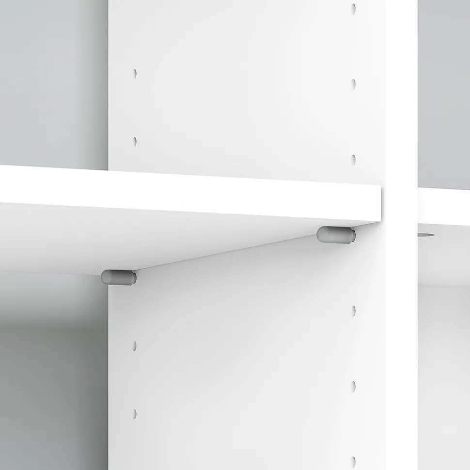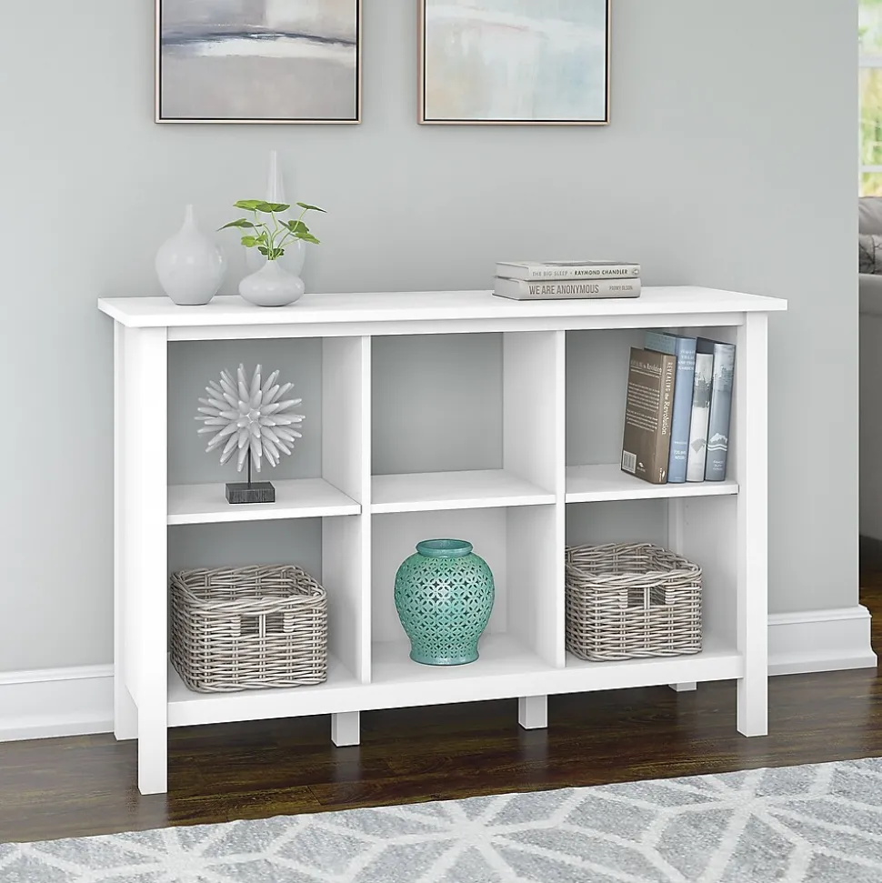 Display art or collectibles with the Bush Furniture Broadview 6 Cube Storage Bookcase to accent your home office, or bring a contemporary flair to work and store books, binders or reference materials. Six storage cubes with two adjustable shelves let you customize the Bookcase to showcase knickknacks or materials of varying shapes and sizes. The white Cube Storage unit matches the height of coordinating desks for an expanded work surface. Broadview’s sturdy post leg design provides years of trouble-free use, while the durable Pure White finish fends off scratches and stains for continued quality. Closed side panels and an open back breathe contemporary life into any room. Backed by a Bush Furniture 1-Year Warranty, Broadview meets ANSI/SOHO standards for performance and safety. See the full collection for coordinating items.