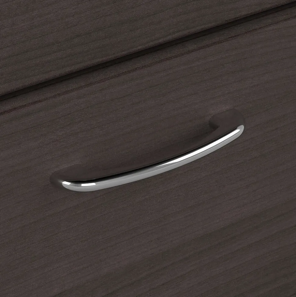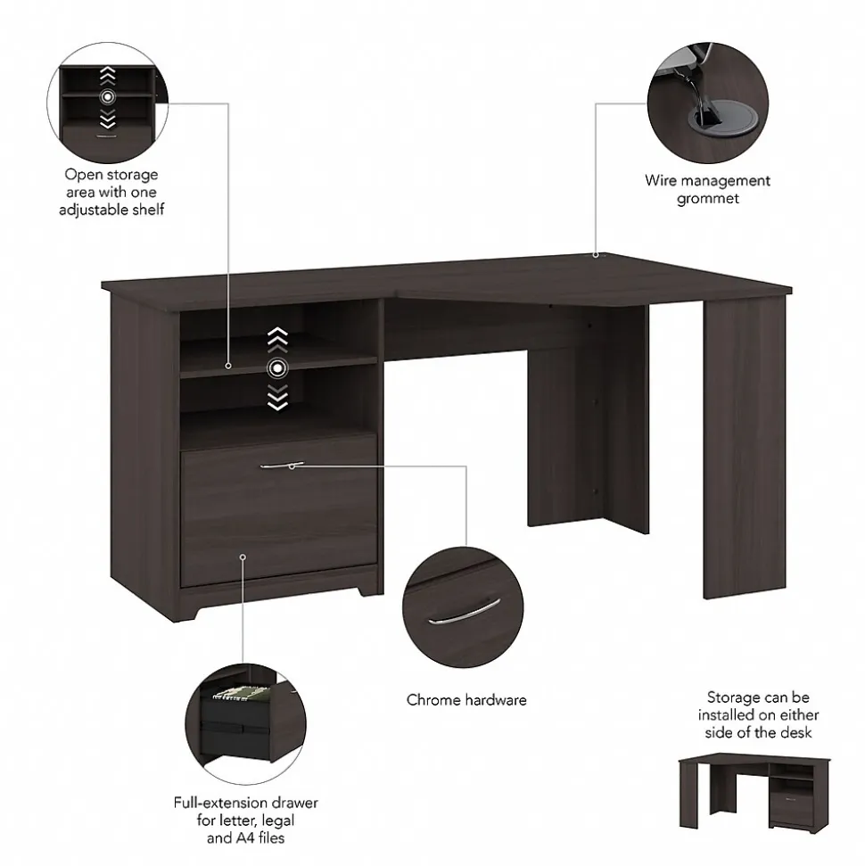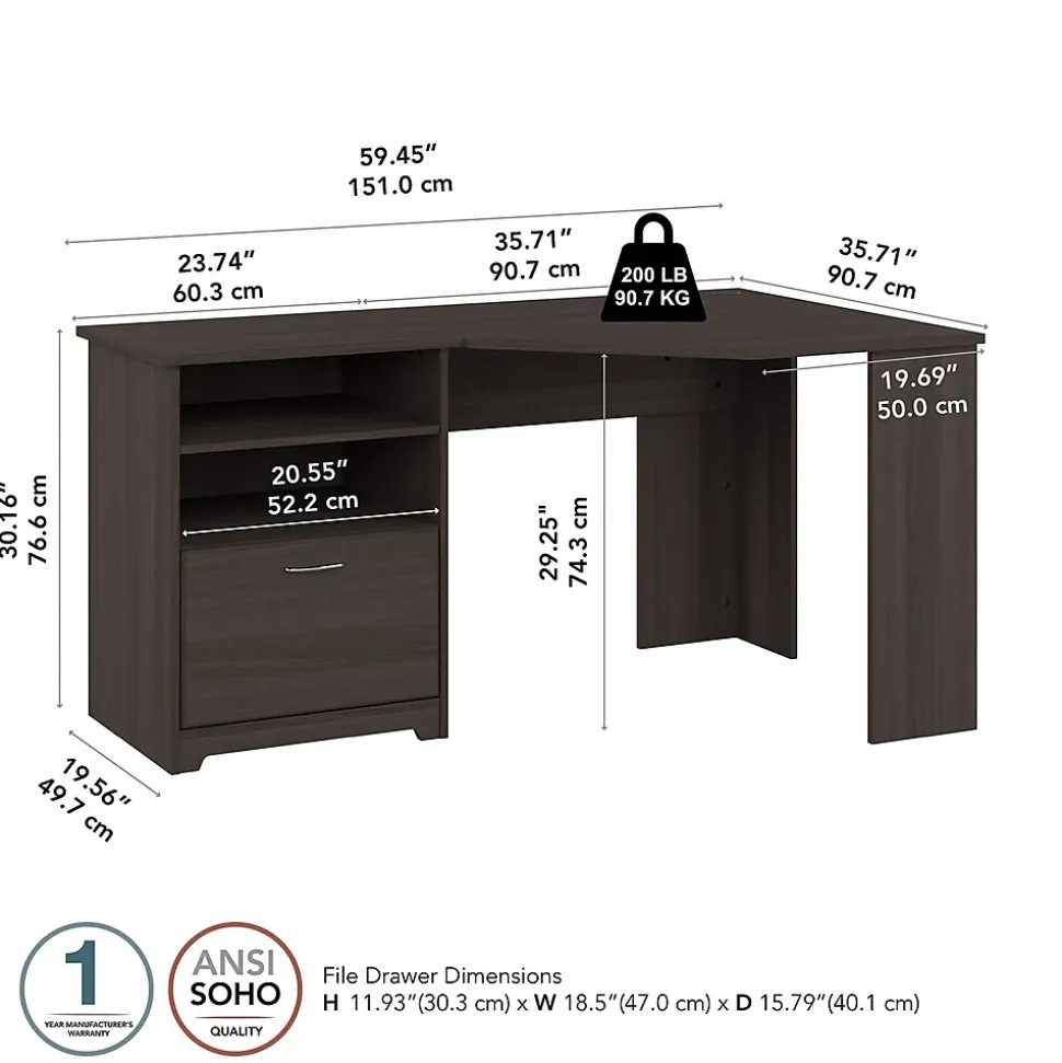 The Bush Furniture Cabot 60W Corner Desk with Storage presents a home office solution with transitional style. Take advantage of the space-saving corner computer desk to spread out with the materials needed for your next project or assignment. The durable desktop supports up to 200 pounds and includes built-in wire management to keep cords and cables out of the way while you work. Organize letter, legal, and A4-size paperwork inside a file drawer that opens on smooth full-extension ball bearing slides. The home office desk’s open storage area includes one adjustable shelf to accommodate books and materials of various sizes. Storage can be installed on whichever side you prefer for a custom workspace configuration. This corner office desk with drawer and shelves has been rigorously tested to meet or exceed ANSI/SOHO standards for safety and performance and is backed by a 1 Year Warranty.
