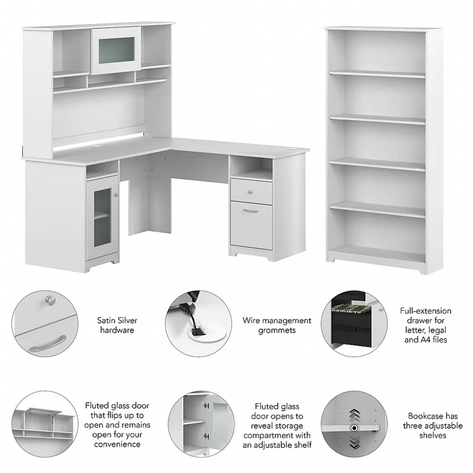 The Bush Furniture Cabot 60W L Shaped Computer Desk with Hutch and 5 Shelf Bookcase presents a home office solution with transitional style. The L Shaped Desk surface supports up to 200 pounds and includes built-in wire management to keep cords and cables out of the way. Organize materials inside a storage cabinet with an adjustable shelf while using the file drawer and box drawer to keep paperwork and office supplies close by. The Desk Hutch adds another closed compartment behind a fluted glass door along with right and left shelves for flexible storage and display. The Tall Bookcase includes three adjustable shelves to accommodate books and decorations of various sizes while two shelves are fixed for stability. This corner desk with bookshelf and hutch has been rigorously tested to meet or exceed ANSI/SOHO quality standards for safety and performance and is backed by a 1 Year Warranty.