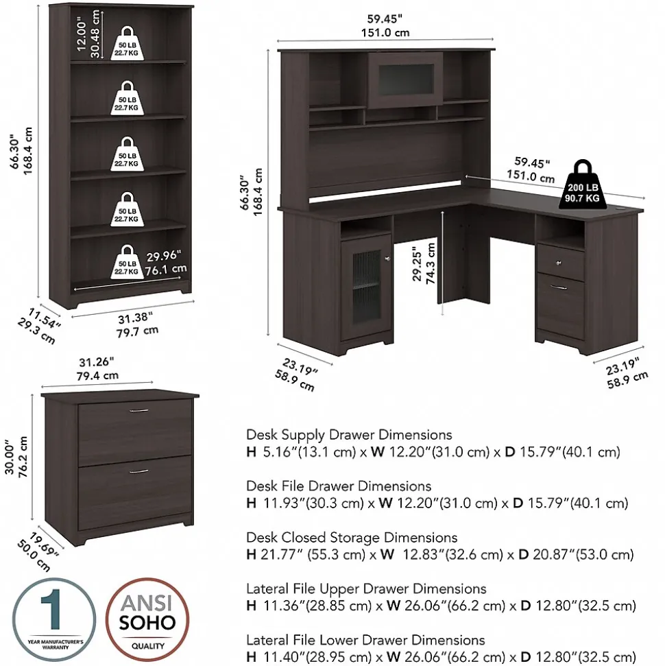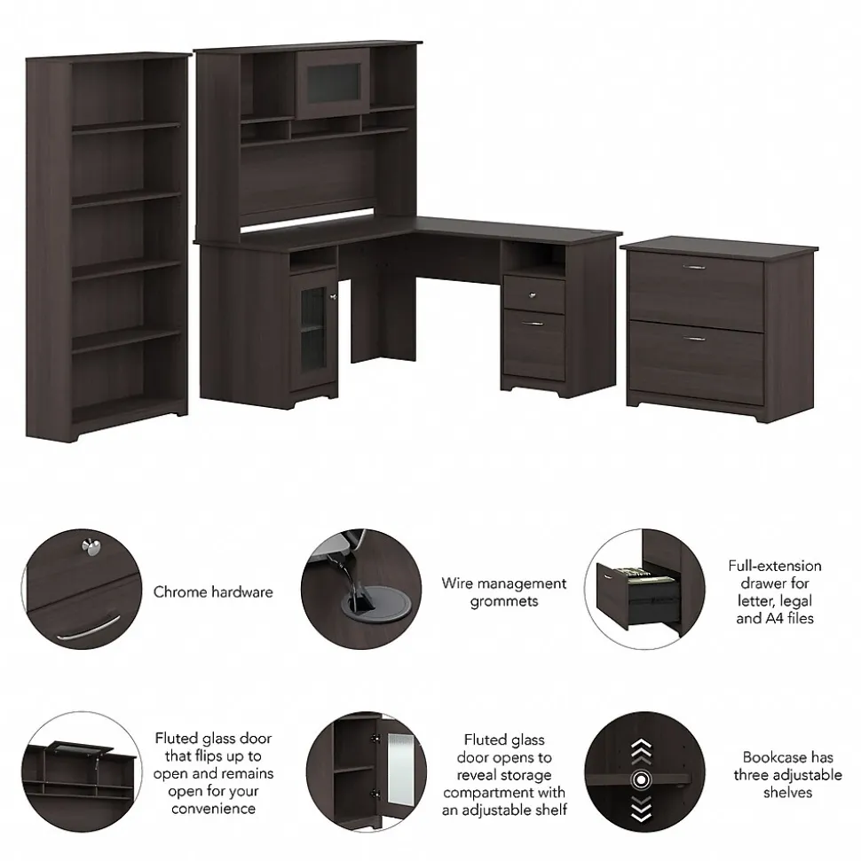 The Bush Furniture Cabot 60W L Shaped Computer Desk with Hutch, File Cabinet and Bookcase presents a home office solution with transitional style. The L Shaped Desk surface supports up to 200 pounds and includes built-in wire management to keep cords and cables out of the way. The Desk Hutch adds another closed compartment behind a fluted glass door along with right and left shelves for flexible storage and display. The lateral filing cabinet’s spacious drawers open on smooth full-extension ball bearing slides for an effortless reach to letter, legal, and A4-size documents. The Tall Bookcase includes three adjustable shelves for books and decorations of various sizes while two shelves are fixed for stability. This corner desk with file cabinet and bookshelf set has been rigorously tested to meet or exceed ANSI/SOHO standards for safety and performance and is backed by a 1 Year Warranty.