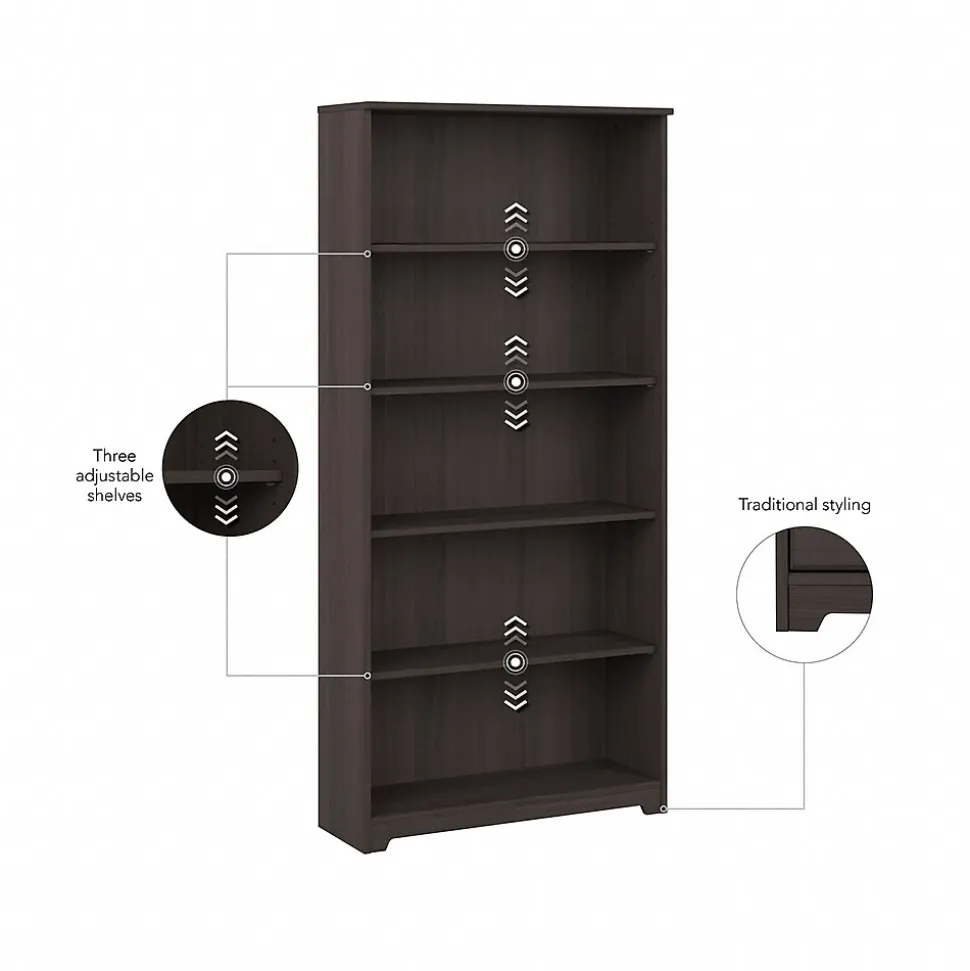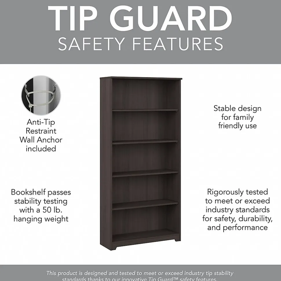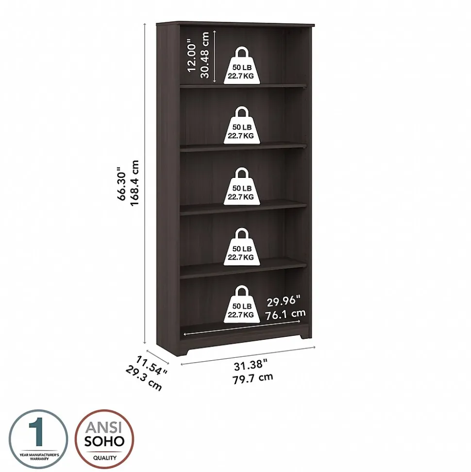 The Bush Furniture Cabot 5 Shelf Bookcase presents a home office storage solution with transitional style. Featuring a design that’s as versatile as it is practical, this tall bookshelf offers an ideal way to organize important work materials, a collection of books or other media, miscellaneous household items, and more. Two shelves are fixed for stability while three can be raised or lowered to accommodate items of various sizes. Each shelf can support up to 50 pounds, so storing larger books and decorations is never a problem. A stable design and included wall attachment hardware makes this standing shelf a great choice for use in a variety of living spaces. This Tall Bookcase has been rigorously tested to meet or exceed ANSI/SOHO standards for safety and performance and is backed by a 1 Year Manufacturer’s Warranty. See the full Cabot Collection for coordinating items available.