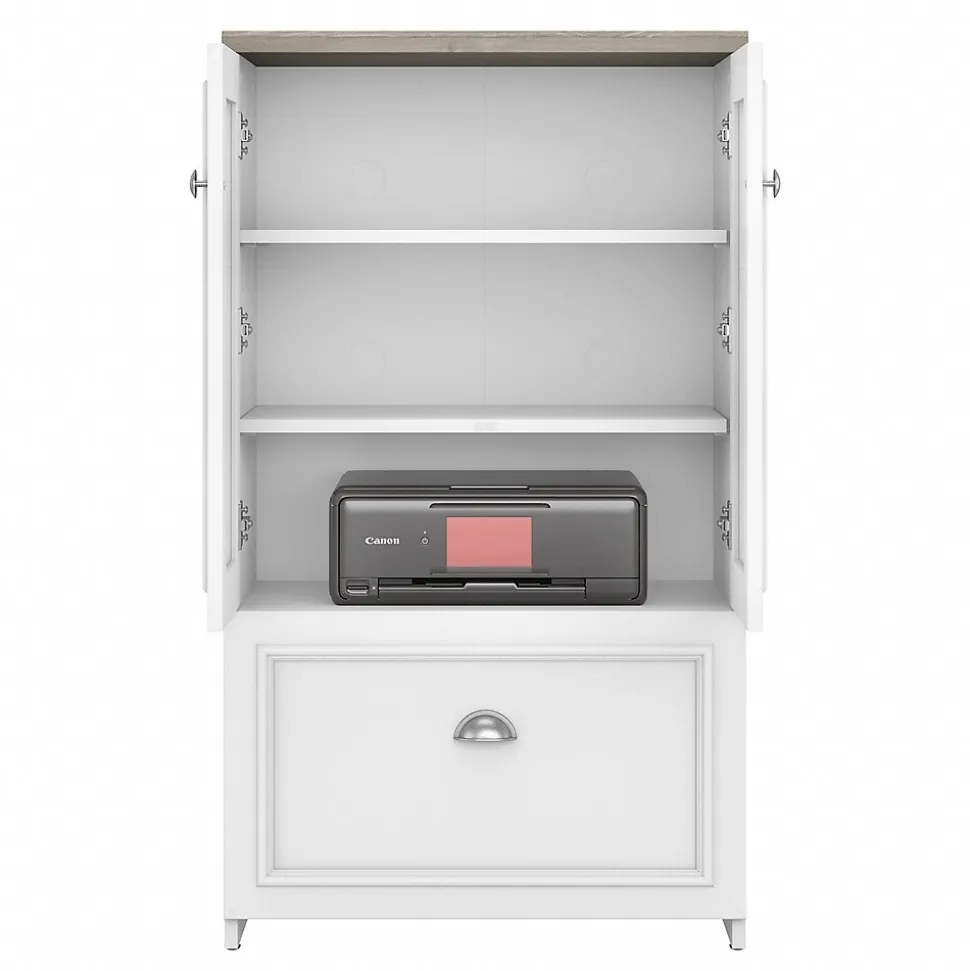 The Bush Furniture Fairview two-door storage cabinet with file drawer is a great way to organize any home office or living space while invoking the cozy, welcoming charm of modern farmhouse styling. Slightly weathered finish pairs with antique pewter hardware to create a casual appearance and durable construction promises to withstand years of regular use. This versatile accent cabinet features stylish louvered doors that conceal three shelves, two of which can be adjusted to store items of various sizes. The file drawer opens on full-extension ball-bearing slides for an effortless reach to letter-, legal-, and A4-size paperwork. The back panel has punched-out holes for wire management and ventilation, making it an ideal choice for storing your laptop and other devices. This farmhouse cabinet is tested to meet ANSI/SOHO standards for safety and performance and is backed by a 6-year warranty.