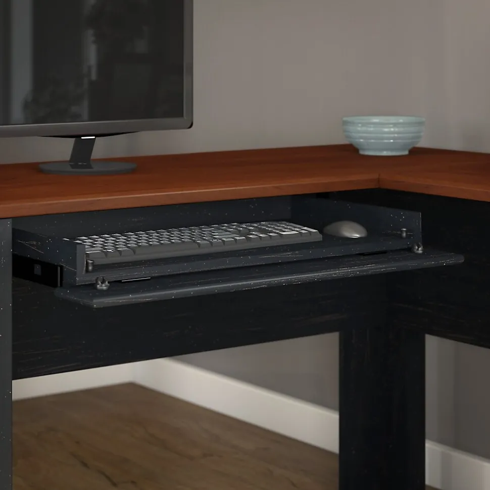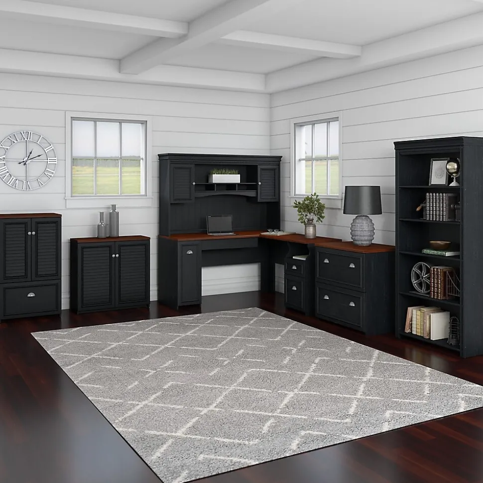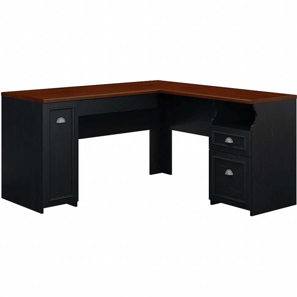 Bring a slice of modern farmhouse styling into your home office with the Bush Furniture Fairview L Shaped Desk. Spread out, surf the net and pay bills on the durable surface, and stash supplies in the box drawer or open storage space. Organize mail in the letter-size file drawer or vertical closed storage area, and store your laptop or keyboard in a drawer with a drop-down front. Antique Pewter hardware adds character to your home office. Attach the Hutch (sold separately) to either side of the L Shaped Desk to fit your needs. Available in attractive Antique Black with Hansen Cherry accents or Antique White with Tea Maple accents, Fairview meets ANSI/SOHO quality test standards for performance and safety, and comes with a 6 Year Manufacturer’s Warranty. See the full collection for coordinating items available, including the Hutch.
