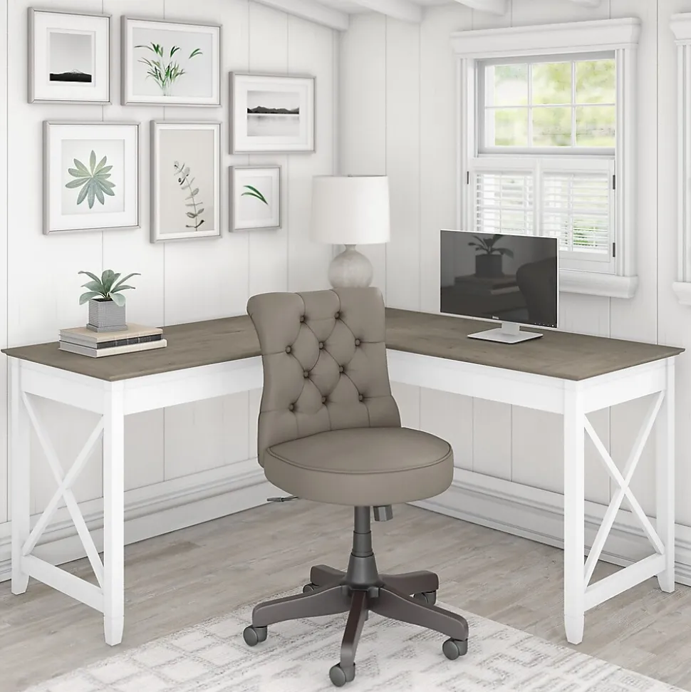 The Bush Furniture Key West L-shaped desk with mid-back tufted office chair offers a practical personal workspace with relaxed farmhouse style. With its practical design and easygoing style, L-shaped desk and chair set offers a perfect workspace solution for home offices. Save space in compact areas by placing the L-desk in a corner or make use of the finished back to take a prominent position in the middle of the room. The durable work surface is spacious enough to spread out with a computer, paperwork, and more while supporting up to 200 lbs. The mid-back office chair, highlighted by its button-tufted upholstery and scrolled backrest, provides a natural complement to Key West’s easygoing style. Foam cushioning gives the seat a medium-firm feel while the swivel chair’s height and tilt tension can be easily adjusted to meet your own personal preferences.