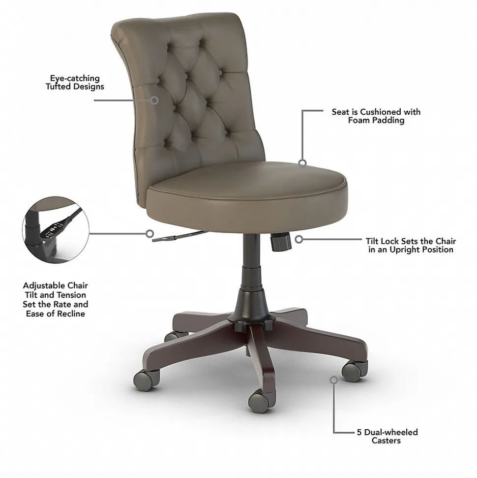 - Office chair’s casual button-tufted upholstery perfectly complements the desk’s relaxed appearance